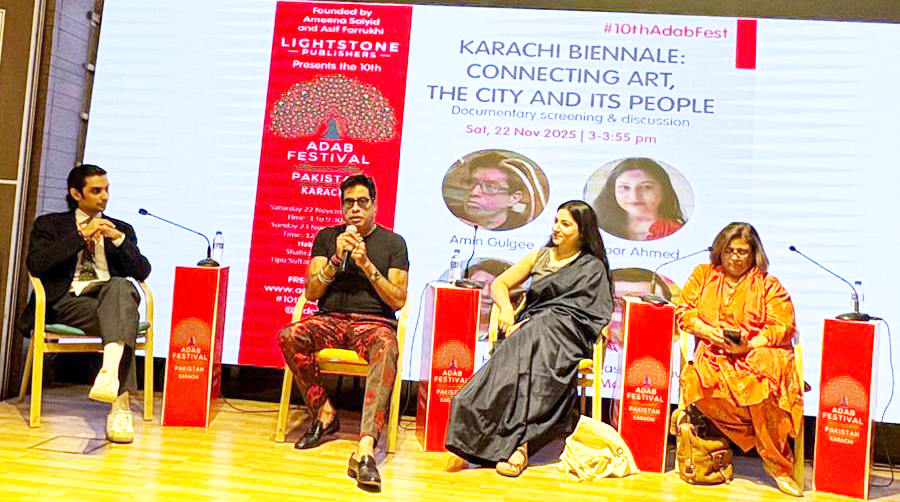A popular session was a critical discussion on ‘Connecting Art, the City and its People’ featuring Noor Ahmed, Amin Gulgee, and Bushra Hussain, moderated by Syed Hasnain Nawab. It highlighted the role of art in shaping urban consciousness. It was followed by a screening of five impressive documentaries by students of different schools who had participated in a film-making workshop organised by Karachi Biennale.