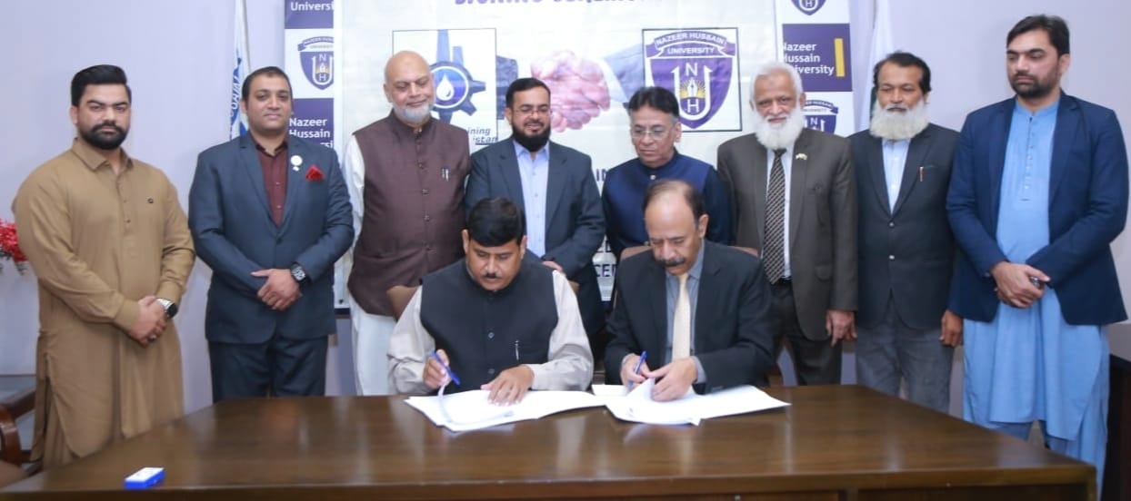 Nazeer Hussain University and the Oil & Gas Training Institute of Pakistan have formally established a strategic partnership through the signing of a Memorandum of Understanding (MoU). The prestigious ceremony was attended by Chancellor Engineer Farhat Muhammad Khan, Vice Chancellor Professor Dr. Masroor Ahmed Sheikh, Registrar Muhammad Afzal, Chairman Imran Farooqi, Principal Waseem Ahmed, Syed Muhammad Asghar (Executive Director & Administrator), along with other distinguished guests.