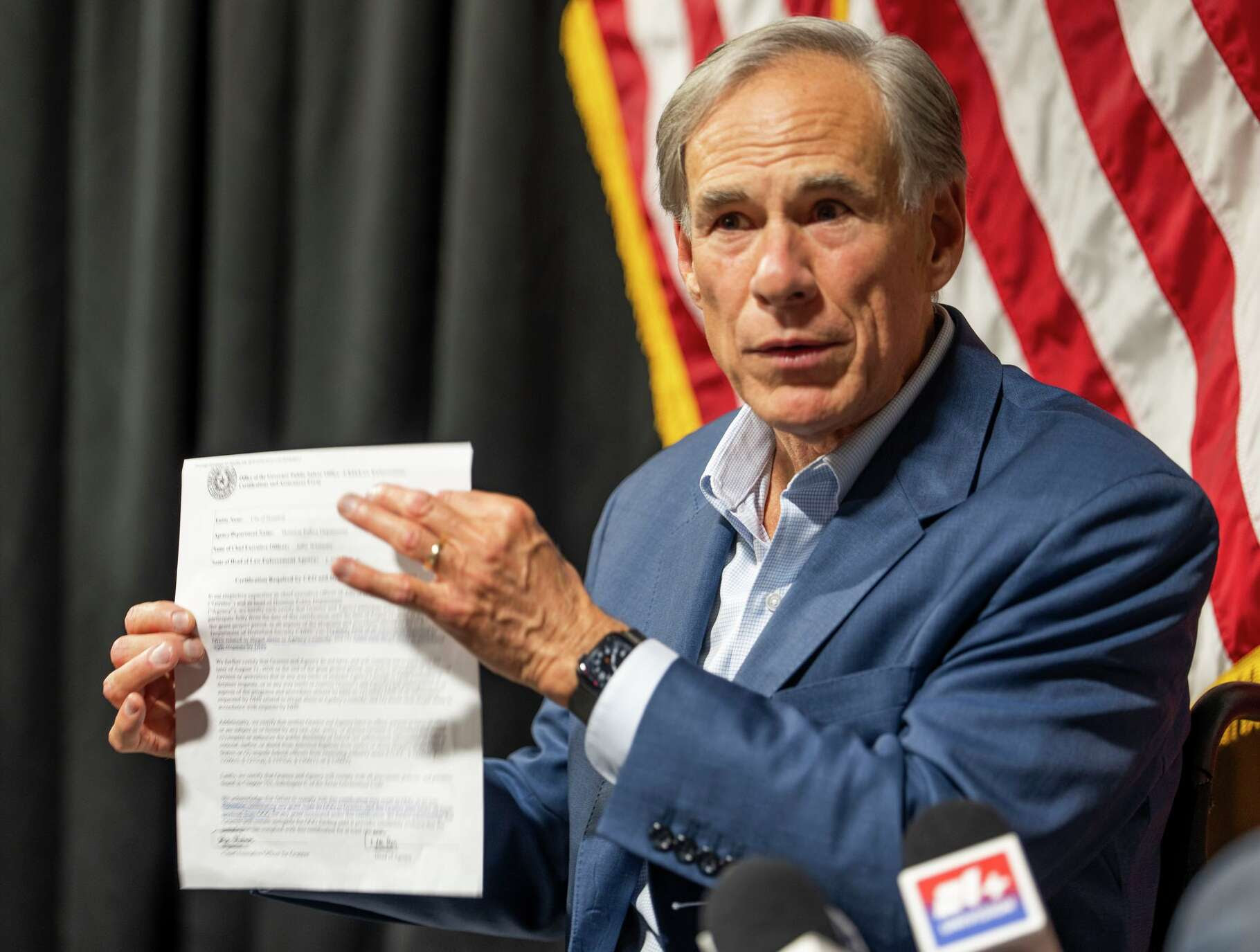 Texas Gov. Greg Abbott on Wednesday said Houston’s newly amended policy on how police interact with federal immigration agents passes muster with him, but that the Houston Police Department “still has not agreed to the terms of what the contract requires.”