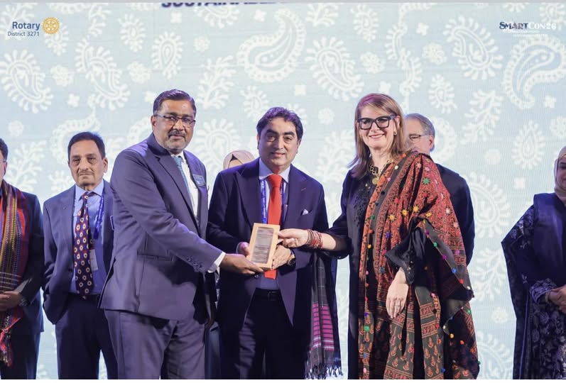 Karachi Pakistan : Abdul Hameed Aslam  Rceived award from Christine Etienne Director Rotary International who came all along from USA as RIPR Rotary International President Representative and Shakeel Khan Kaimkhani Rotary District Governor for sponsoring Smartcon Rotary District Conference at Hyderabad Sindh.