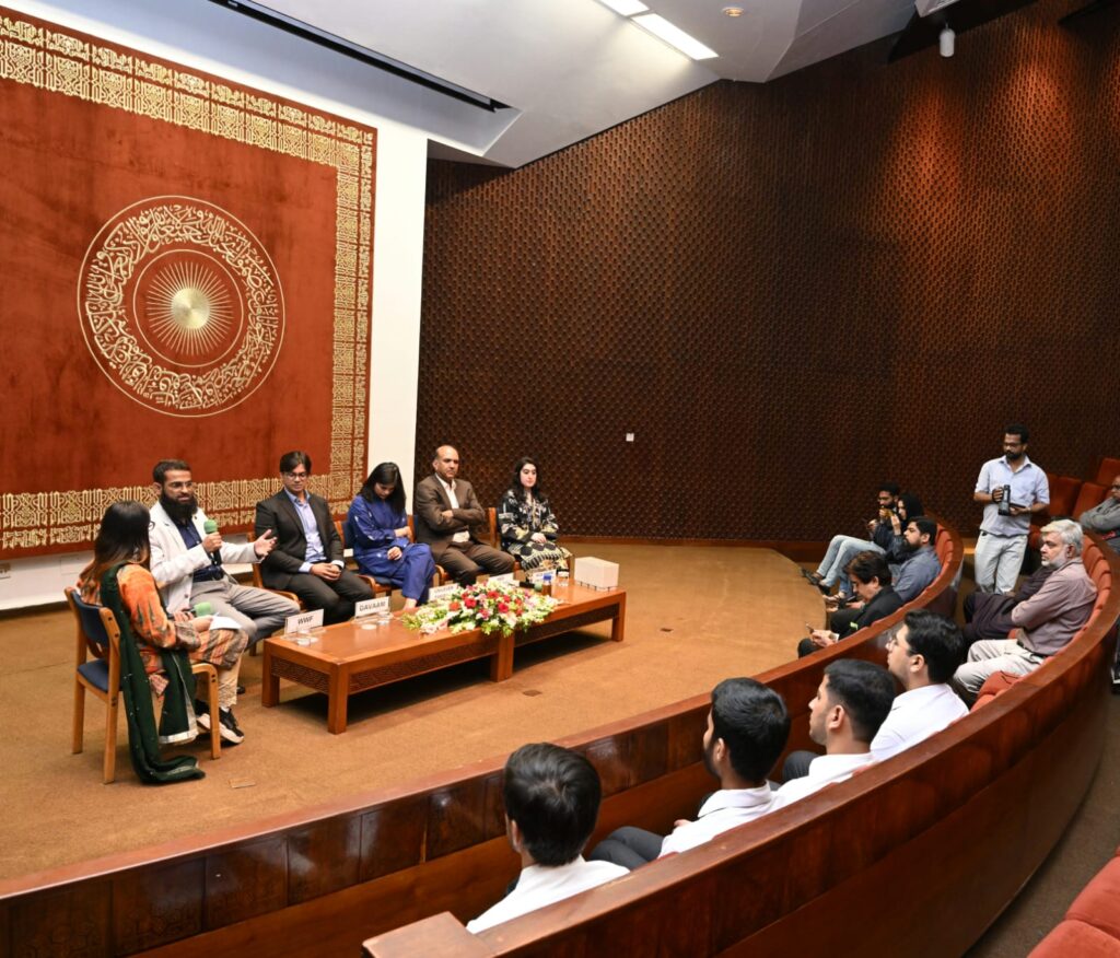 The panel discussion revolving around the topic of “Addressing plastic pollution through innovative and local solutions”, brought together experts from various fields to explore effective strategies to tackle the plastic crisis of global proportions. The panel included Mr. Ghazi Salahuddin, Regional Head (Sindh and Balochistan) at WWF Pakistan, Ms. Ramlah Tariq, Sustainability Lead at Unilever Pakistan, Mr. Salman Tariq, CEO at Davaam, Dr. Mehmood Ali, Associate Professor, Department of Environmental Engineering at NED University, and Ms. Amber Ajani, Manager Environment and Sustainability at the Aga Khan University.