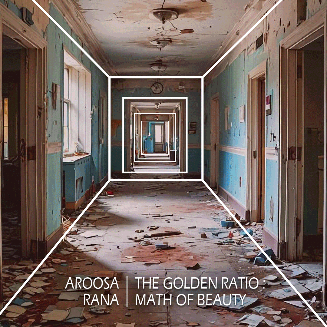 I overlay the golden ratio onto images of Gaza , commenting on how a symbol of classical harmony is used to frame devastation. The spiral , associated with divine proportion & visual perfection, becomes a form of camouflage.