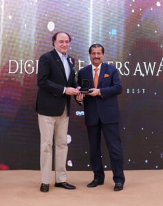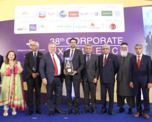 Dr.Mirza Ikhtiar Baig presenting Digi Leaders Award to President HBL Muhammad Aurangzeb at the Digi Leaders Conference 2023. October 9, 2023