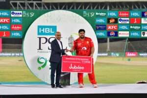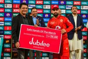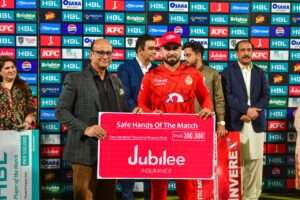 Jubilee Life Insurance presents the “Wicketkeeper of the Tournament “Award after HBL PSL Season 9 Final. March 20, 2024