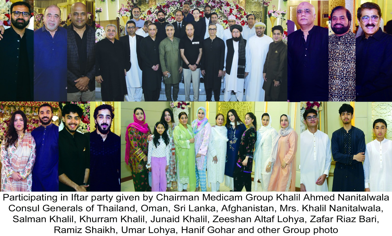 Karachi – A grand Iftar and dinner ceremony organized by the Consul General of Djibouti and Chairman of Medicam Group of Companies for Medicam Pakistan during the holy month of Ramadan was held in a very spirited and dignified atmosphere. This blessed gathering was attended by important figures from diplomatic, administrative, social, and financial circles and demonstrated a practical way of sharing the blessings of Ramadan. The ceremony was attended by Consul Generals of Thailand, Oman, Sri Lanka, Afghanistan, Mrs. Khalil Nanitalwala, Salman Khalil, Khurram Khalil, Junaid Khalil, Zeeshan Altaf Lohya, Zafar Riaz Bari, Ramiz Sheikh, Omar Lohya, Hanif Gohar, Mrs. Khalil Nanitalwala, Mrs. Khurram Khalil, former SSP Traffic Saeed Arain, DSP Tufail Ahmed, DSP Ferozabad Mona Bhai, Dr. Qaiser Waheed, former DIG Aamir Farooqui and other distinguished guests. On this occasion, the distinguished guests highlighted the spiritual virtues of Ramadan and the importance of promoting brotherhood, sisterhood, and social harmony
