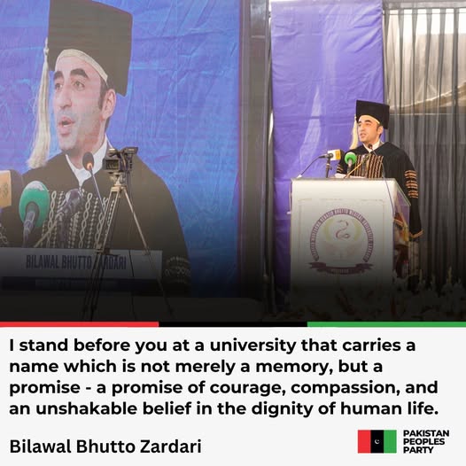 LARKANA : Chairman PPP Bilawal Bhutto Zardari addresses the Convocation ceremony of Shaheed Mohtarma Benazir Bhutto Medical University (SMBBMU) in Larkana today, and reaffirms his vision of establishing world-class educational and healthcare institutions in every district of Sindh.