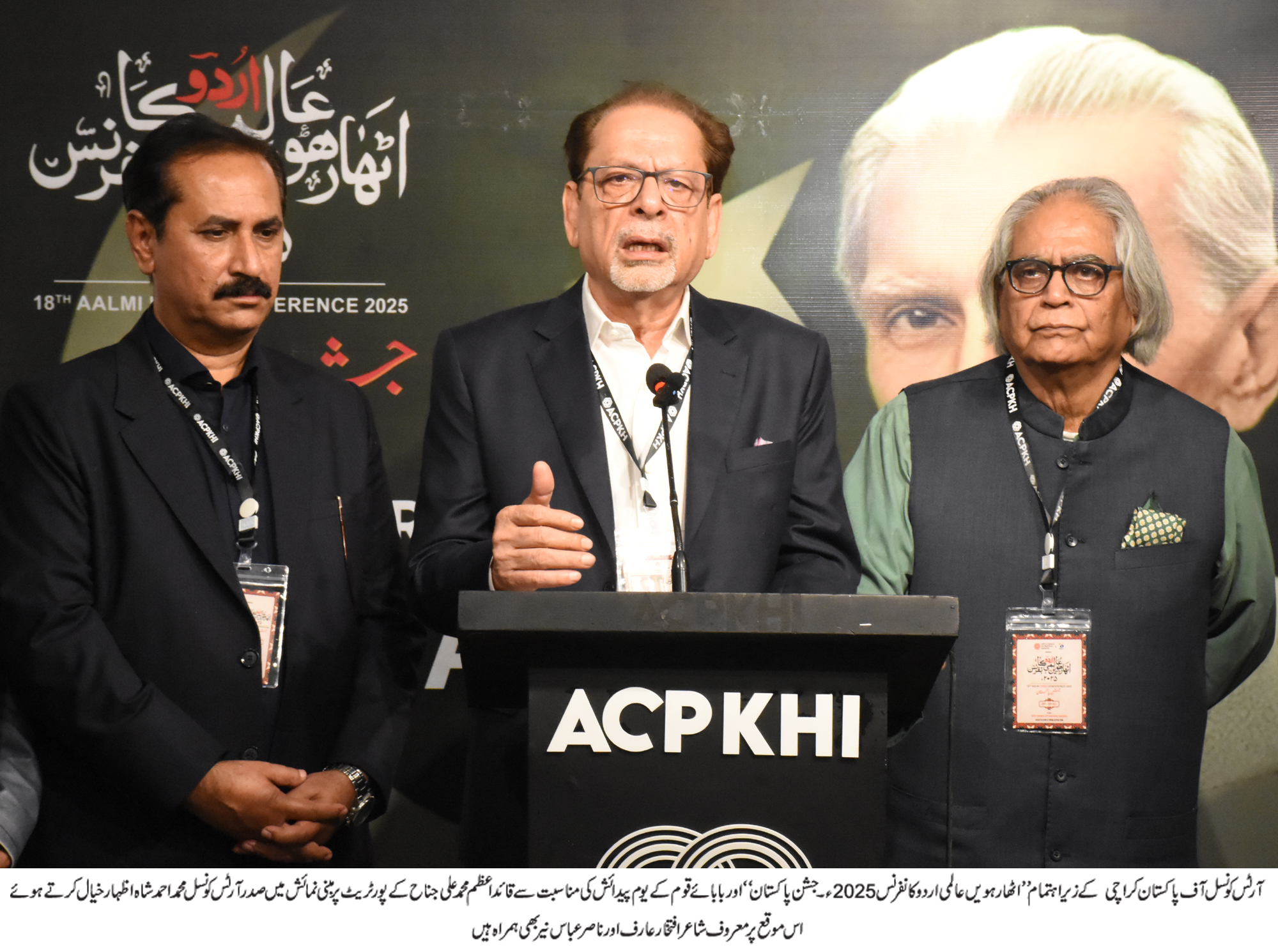 Artists whose works were displayed included Rahat Naveed Masood, Ali Azmat, Ajab Khan, Nasir Shehzad, Kaleem Khan, Naseeb Khan, Farrukh Shahab, Ghulam Abbas Kamangar, Mehtab Ali, Rustam Khan, Muzammil Khan, Irfan Hassan, Muhammad Darab, Tanweer Farooqi, Faiz Supro, Sumera Javed, Munawar Ali Syed, Shehzad Baloch, Sandeep Kumar, and Khalid Khan.  Addressing the audience, Iftikhar Arif said that although he resides in Islamabad, he shares a deep emotional bond with Karachi. He stated that the Aalmi Urdu Conference has projected Pakistan on the global cultural map and that no other institution is doing comparable work. He emphasized that cultural diplomacy is the most lasting form of diplomacy and added that dialogue between identities is essential. He termed the Arts Council an institution that is now discussed worldwide, with people planning international travel to attend the conference. Referring to past turmoil in Karachi, he said the present unity under one roof is nothing short of a miracle.