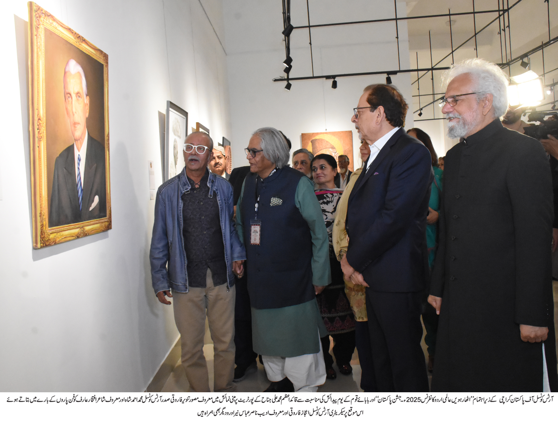Karachi Pakistan : Arts Council of Pakistan Karachi organized a special portrait exhibition of Quaid-e-Azam Muhammad Ali Jinnah, titled “National Art Exhibition,” in connection with the birth anniversary of the Father of the Nation, along with a briefing on the four-day “18th Aalmi Urdu Conference 2025 – Jashan-e-Pakistan”. The exhibition was held at Ahmed Parvez Art Gallery and was inaugurated by renowned poet Iftikhar Arif along with President Arts Council Muhammad Ahmed Shah. Prominent literary and art figures including Nasir Abbas Nayyar, Farrukh Tanveer Shahab, Tanweer Farooqi, Shahid Rassam, G.N. Qazi, Ejaz Farooqi, Fatima Hasan, Chand Gul Shah and other art enthusiasts attended the opening ceremony.Portraits of Quaid-e-Azam created by 20 artists from across Pakistan remained the center of attention.