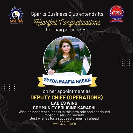 Karachi : Congratulations ,Sparks Business Club extends its heartfelt congratulations to Chairperson SBC, Ms. Syeda Raafia Hasan on her appointment as Deputy Chief (Operations), Ladies Wing, Community Policing Karachi.