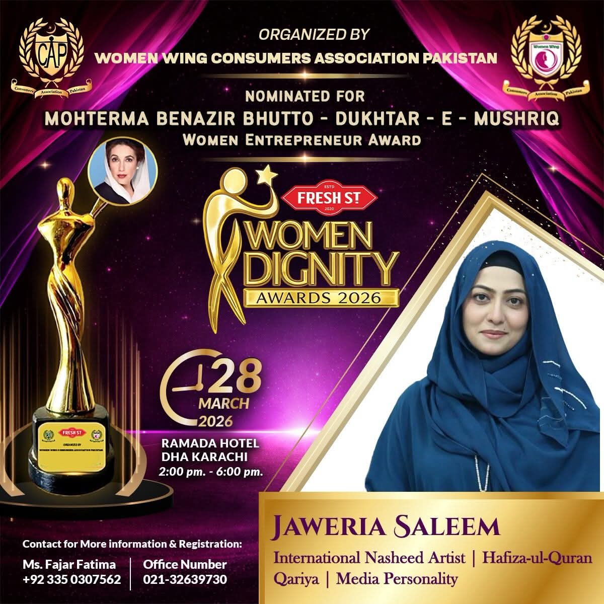 The Consumers Association of Pakistan (CAP) extends its heartfelt congratulations to Ms. Jaweria Salem on being honored with the Shaheed Mohtarma Benazir Bhutto Women Leadership Award.