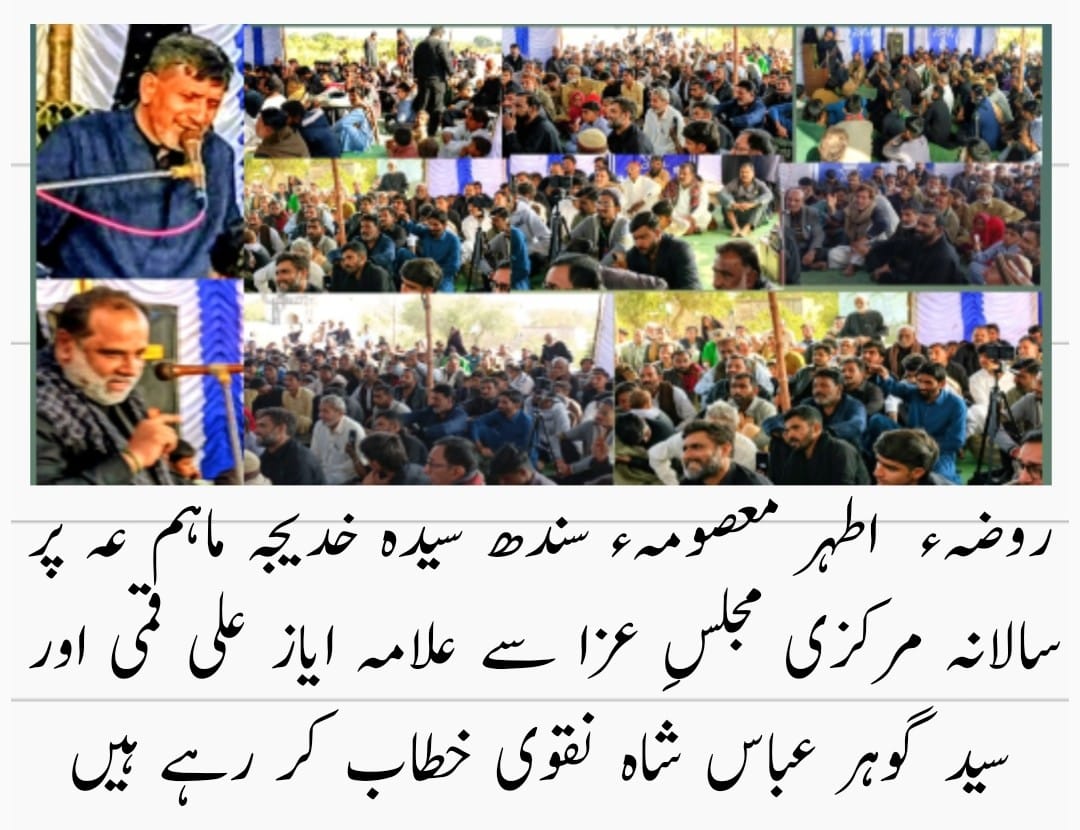 These views were expressed by Allama Ayaz Ali Qumi and renowned Zakir-e-Ahl-e-Bait (AS) Syed Gauhar Abbas Naqvi while addressing the central annual Majlis-e-Aza held in connection with the martyrdom of Imam Musa Kazim (AS) at Roza-e-Athar Masooma-e-Sindh Syeda Khadija Maham (AS) in Agham Kot, Sindh. The annual mourning gathering was organized by the Zaireen Khidmat Committee Agham Kot Sindh under the patronage of Syed Manzar Naqvi.