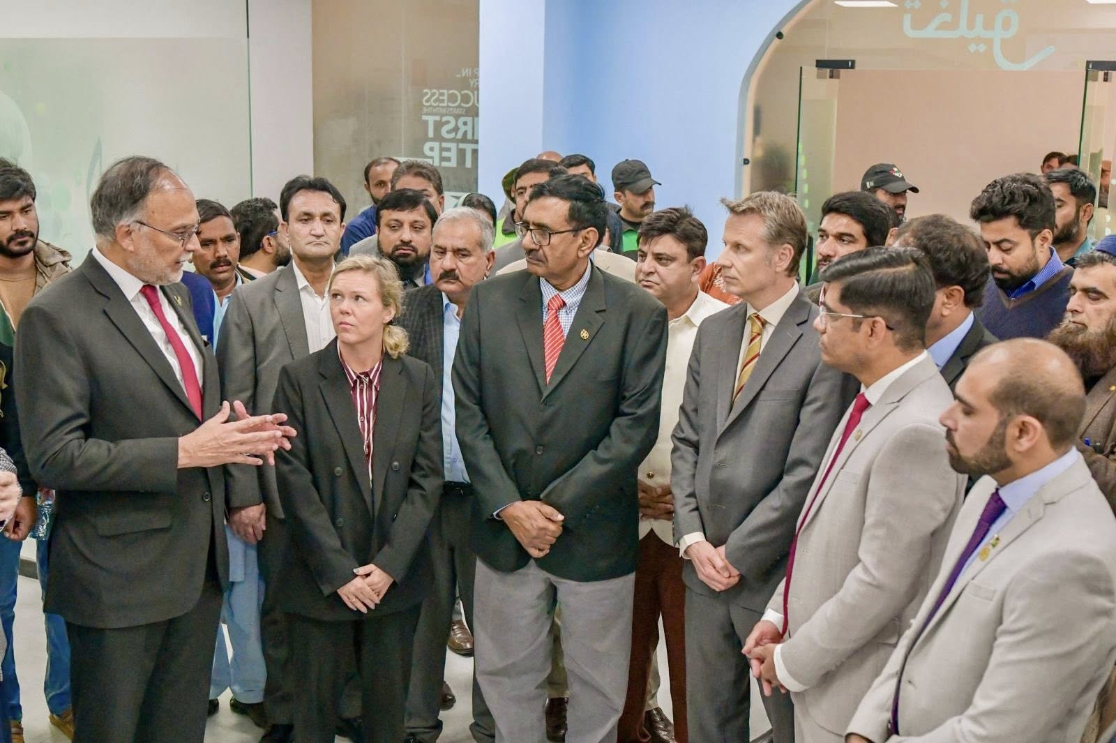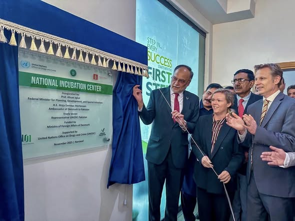Federal Minister for Planning, Development and Special Initiatives Prof. Ahsan Iqbal, Ambassador H.E. Maja Derrous Mortensen, and UNODC Pakistan Country Representative Mr. Troels Vester jointly inaugurated the centre – a vibrant new hub where young Pakistanis can turn ideas into practical solutions for their communities.