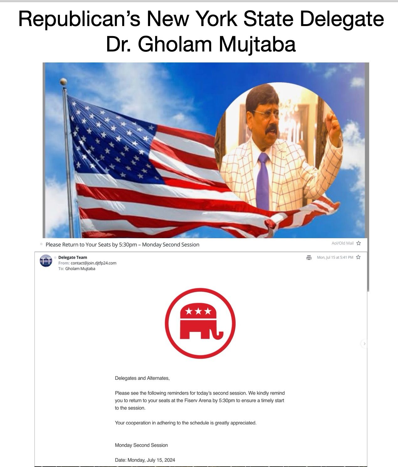 New York USA : Dr. Gholam Mujtaba served as a New York State Delegate to the Republican Party during the 2024 Presidential Elections, a prestigious position that reflects both trust and recognition within the party’s leadership. A state delegate plays a critical role in shaping the party’s platform and officially nominating the presidential candidate at the Republican National Convention. Delegates are either elected or appointed to represent their state and are entrusted with casting votes that influence the direction of national Republican strategy.
