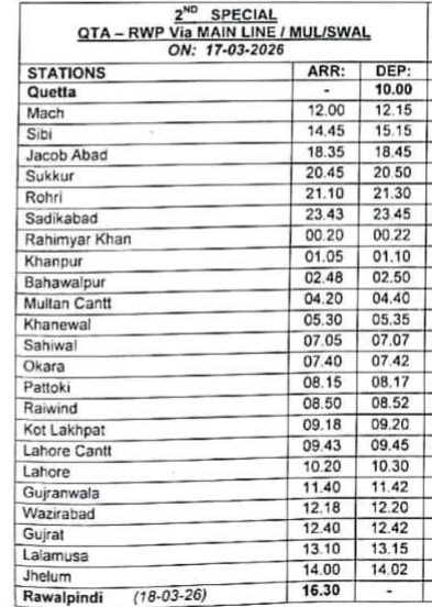 The second service will operate from Quetta to Rawalpindi on March 17, with scheduled stops at Sukkur, Rahim Yar Khan, Khanewal, and Lahore.