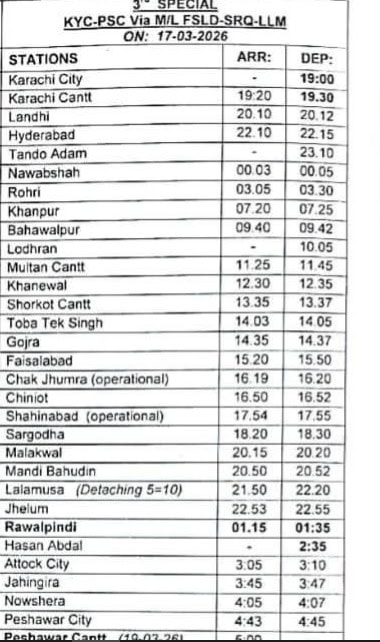 Another train will travel from Karachi to Peshawar on March 17.