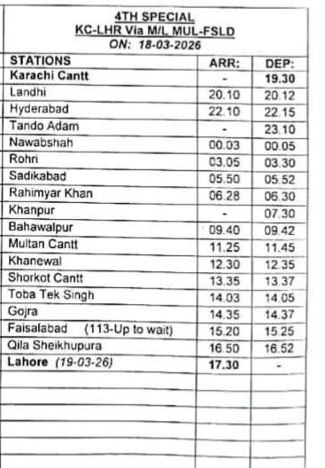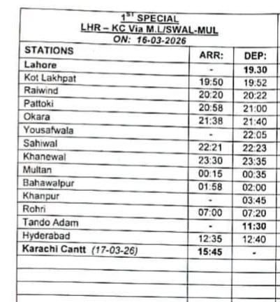 The fourth special service will run from Karachi to Lahore on March 18.