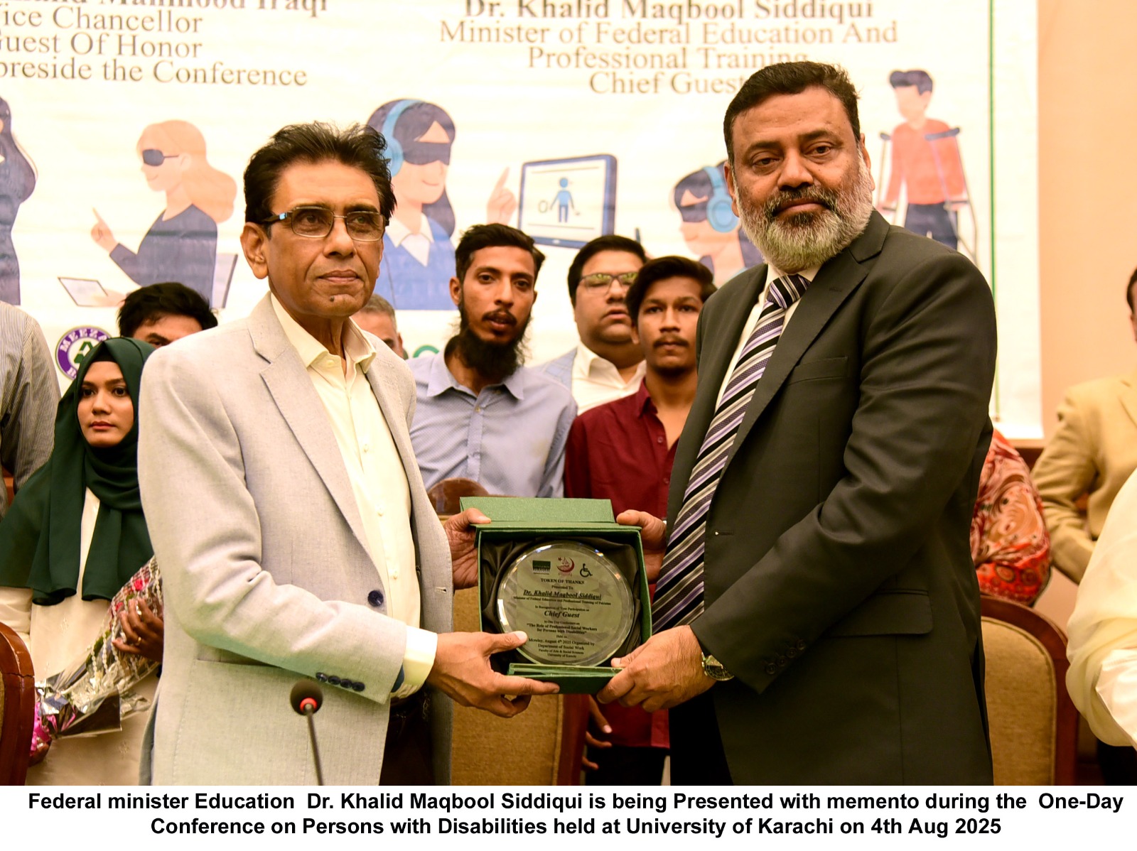 Karachi – August 4, 2025: Federal Minister for Education and Professional Training, Dr. Khalid Maqbool Siddiqui, addressed a media talk during a one-day conference organized by the University of Karachi at the Chinese Teachers Memorial Auditorium. The conference focused on promoting inclusive reforms and enhancing the welfare of persons with disabilities.