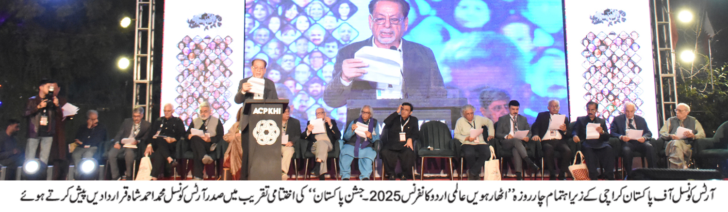 small team and transformed the Arts Council into an “Art City.” “When I feel stressed, I come to the Arts Council; the atmosphere here carries the fragrance of freedom,” he remarked. He added that organizing a 40-day World Culture Festival followed immediately by the Aalmi Urdu Conference required extraordinary passion and dedication, qualities that Muhammad Ahmed Shah possesses. He assured full cooperation from the Sindh government in implementing resolutions presented by the Arts Council and emphasized reviving the culture of book reading among children. Speaking on the occasion, Arts Council President Muhammad Ahmed Shah said