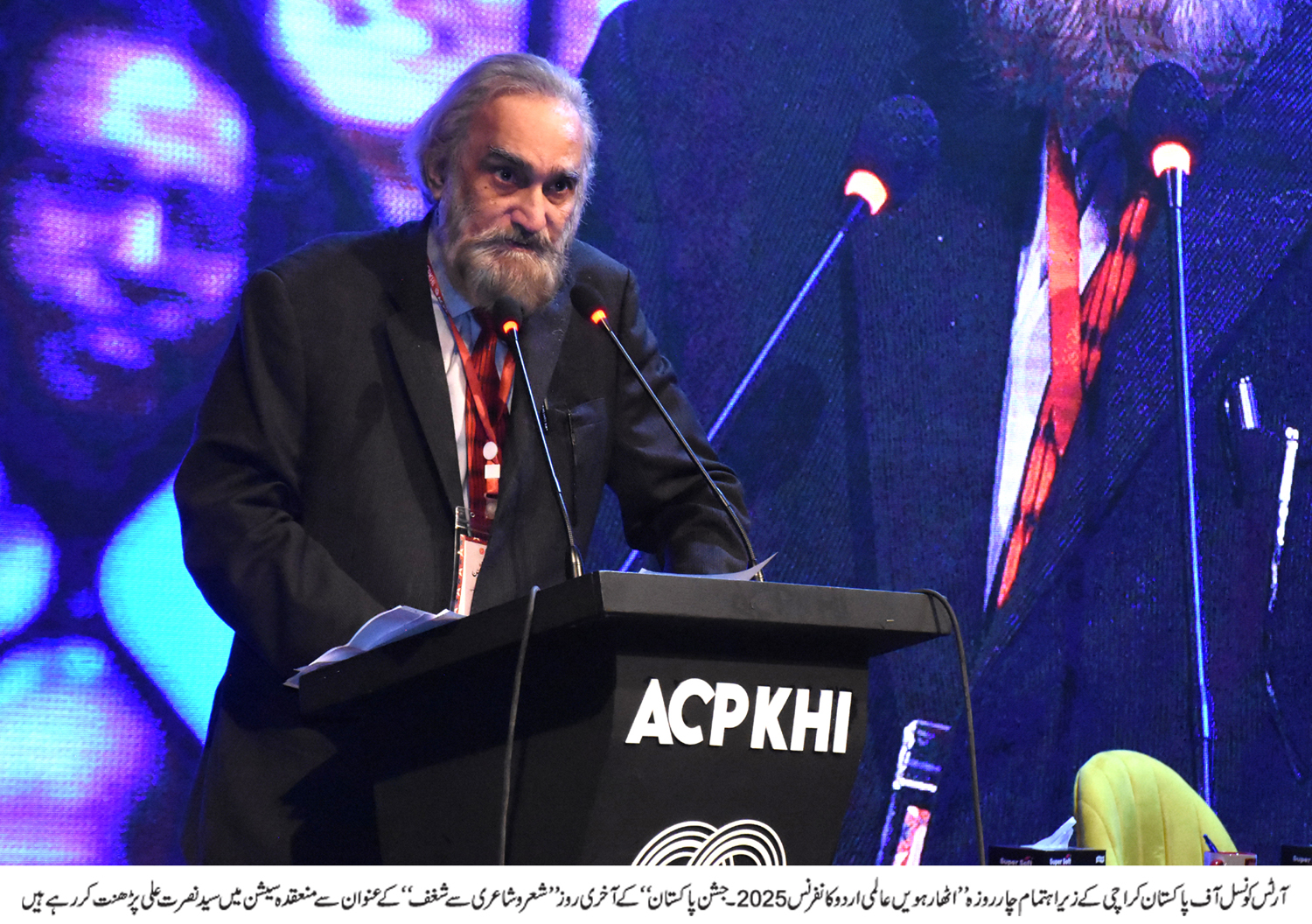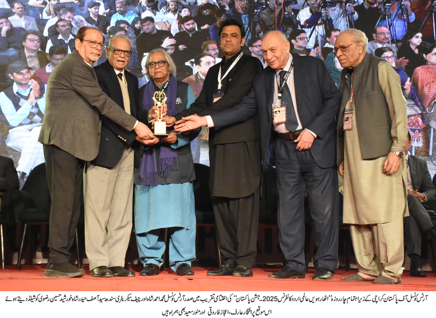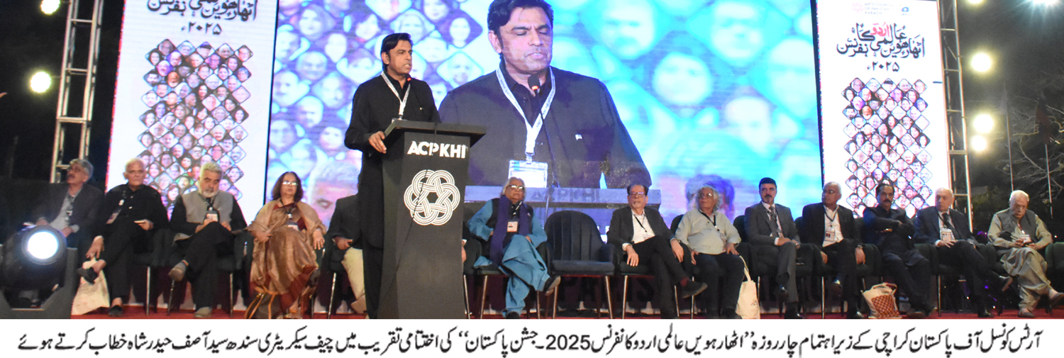 KARACHI: four-day “18th Aalmi Urdu Conference 2025 – Jashan-e-Pakistan”, organized by the Arts Council of Pakistan Karachi, concluded at the YMCA Ground, encapsulating the diverse colors of literature and fine arts. The concluding session was presided over by renowned poet Iftikhar Arif, while Chief Secretary Sindh Syed Asif Hyder Shah attended as the chief guest.A large number of prominent literary figures and intellectuals were present on the stage, including Arts Council President Muhammad Ahmed Shah, Khurshid Rizvi, Nasir Abbas Nayyar, Asghar