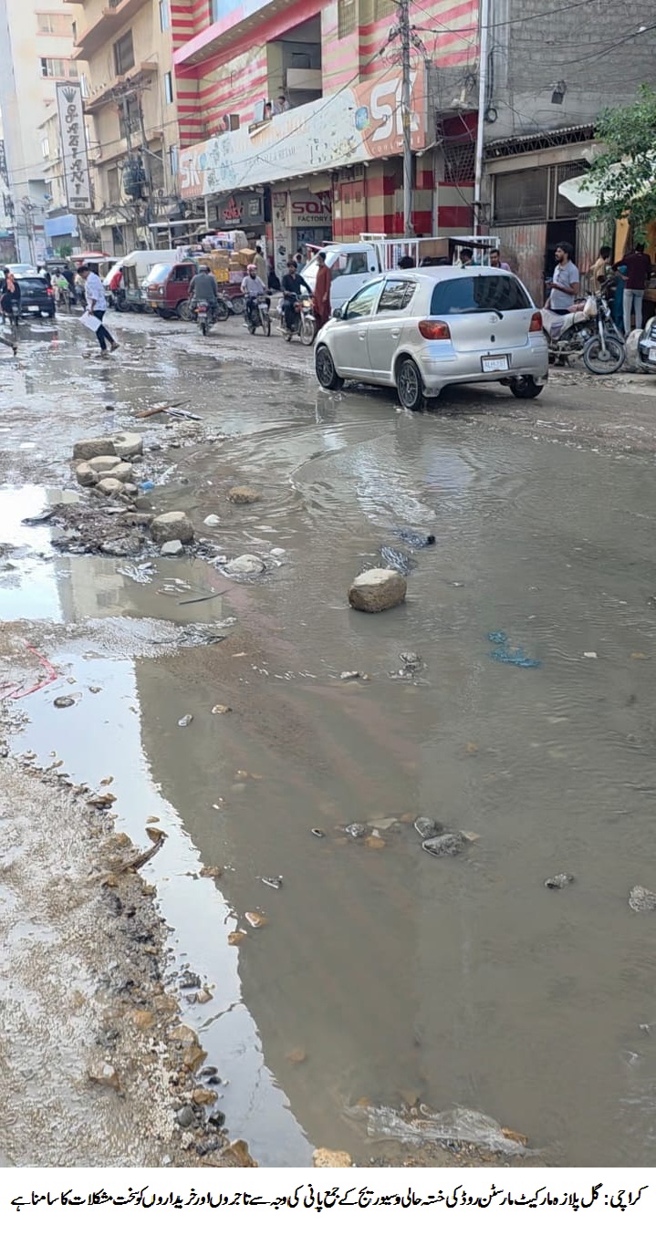 Karachi (Staff Reporter): The dilapidated condition of Marston Road and the accumulation of sewage water outside Gul Plaza Market and other key commercial centers have created severe problems for traders and buyers. Potholes have appeared all over the road, and due to rainwater and sewage covering them, accidents are occurring frequently. According to citizens, motorcyclists and car drivers are often injured after slipping and falling, while the foul-smelling water has made the environment unbearable.