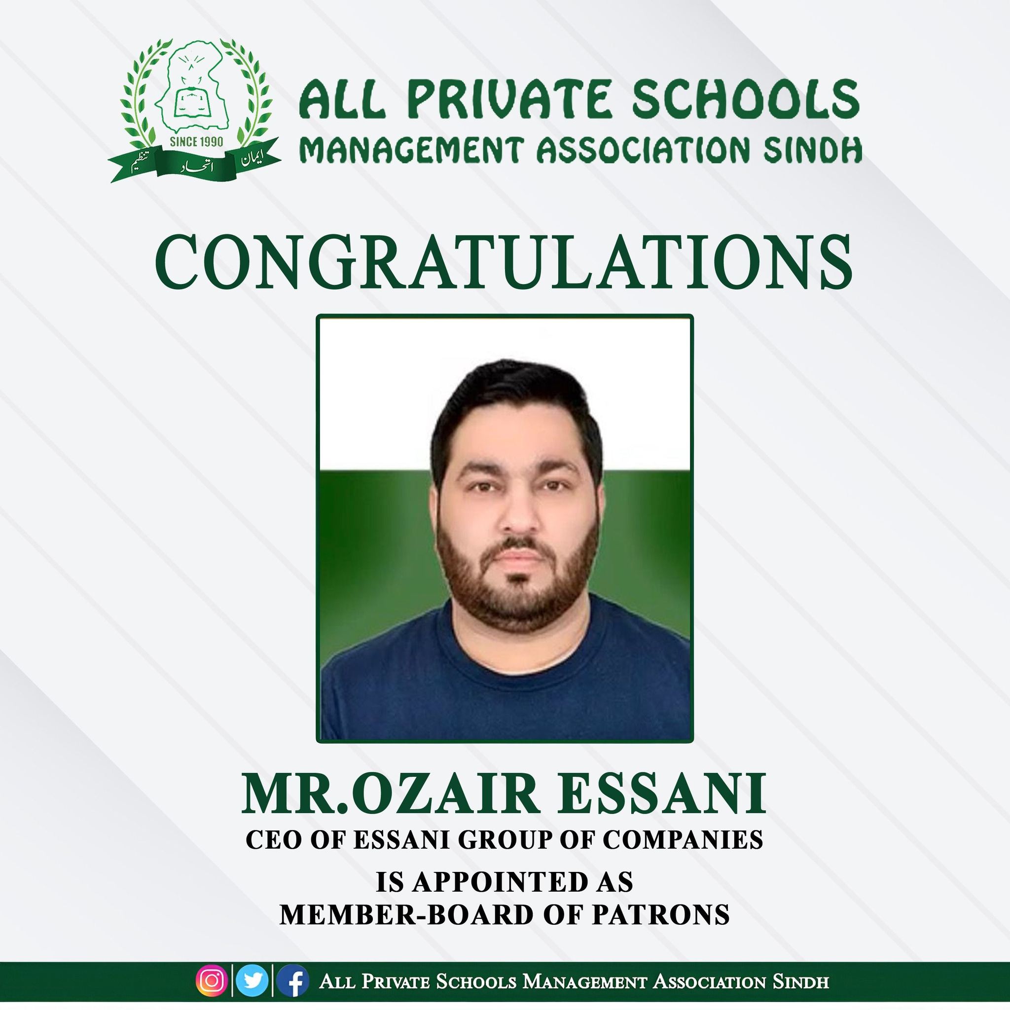 Karachi: Heartfelt congratulations are extended to Mr. Muhammad Ozair Essani, CEO of Essani Group of Companies and former Advisor to the Governor of Sindh, on his recent nomination as a Member of the Board of Patrons of the All Private Schools Management Association Sindh.