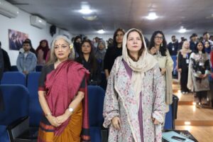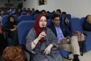 The first panel discussion, titled “Storytelling, Drama Writing & Innovation in the Digital Age,” was moderated by Prof. Dr. Yasmeen Sultana, Dean, Faculty of Media & Design, ILMA University. The panel featured Prof. Saleem Mughal, Educationist and Media Consultant; Sheema Kermani, Founder and Artistic Director of Tehrik-e-Niswan; Sajid Hassan, Actor, Script Writer & Director; Mansoor Ahmed Khan, Drama Writer, Director, and Producer; and Kulsoom Aftab, Actress and Founder of THEAKADA. The discussion highlighted evolving storytelling formats, digital disruption in drama production, and innovative narrative techniques in the digital age.