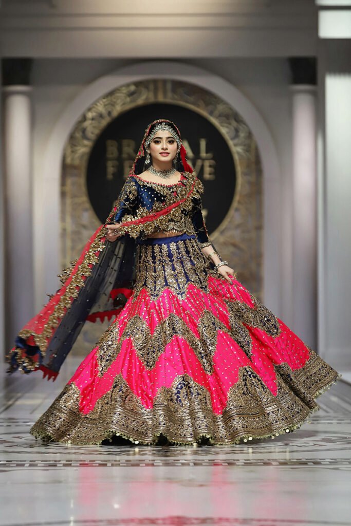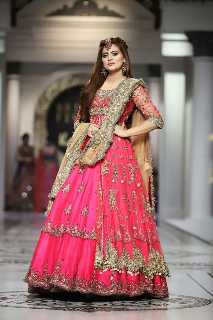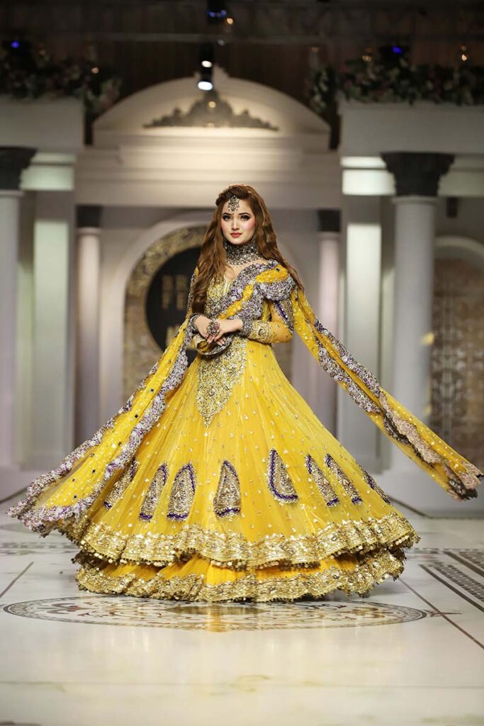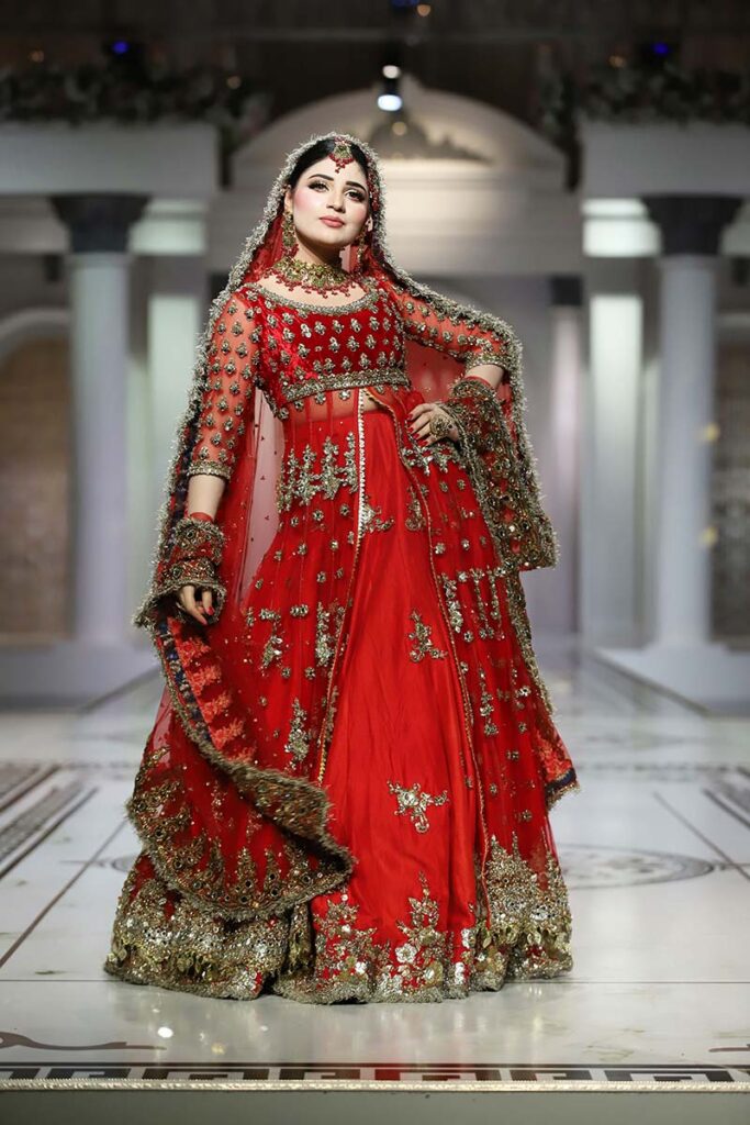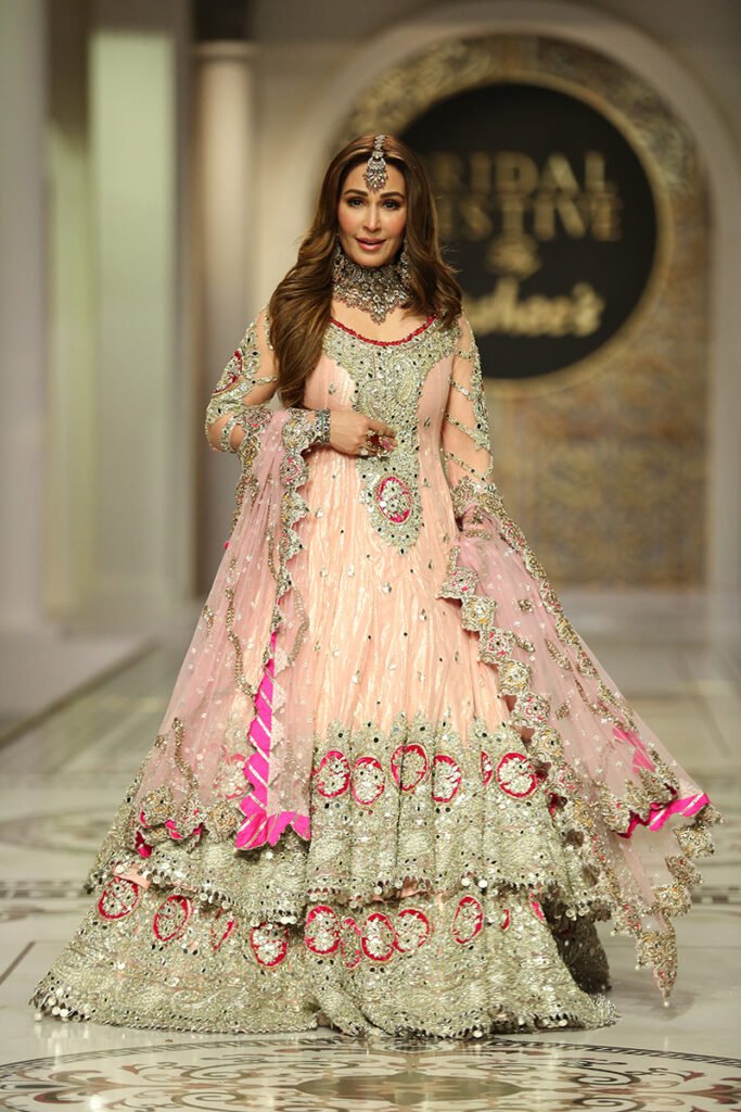 Like the brand’s debut showcase in HBCW which featured a long list of celebrities as showstoppers, Kashee’s solo show also had a fantastic line-up of celebrities sashaying down the catwalk. Film star Sana Fakhar opened the show for Kashee’s while TikTok star Rebecca, Madiha, Saba Faisal and Sarwat Gillani closed the Mayoon segment of the show. Shagufta Ejaz, Benita David, Nadia Hussain and Sehar walked as show-stoppers in the Mehndi segment, whereas Saba Faisal, Rebecca and Neelam Muneer graced the ramp in the Baraat segment. The final segment of the showcase was opened by Dr Shaista Lodhi, whereas Suneeta Marshal, Sana Fakhar and Benita also graced the catwalk. The show came to an end as the ever gorgeous Reema Khan walked down the ramp in thunderous applause by the attendees.