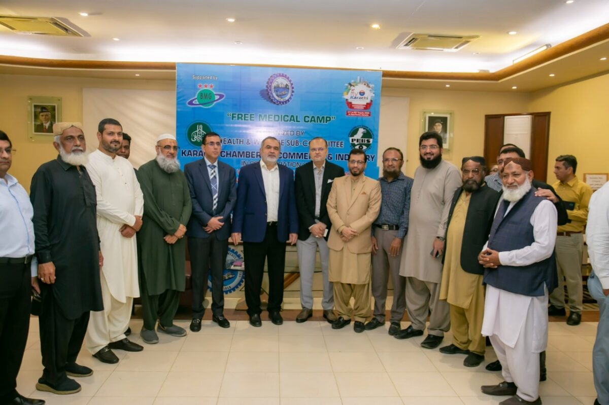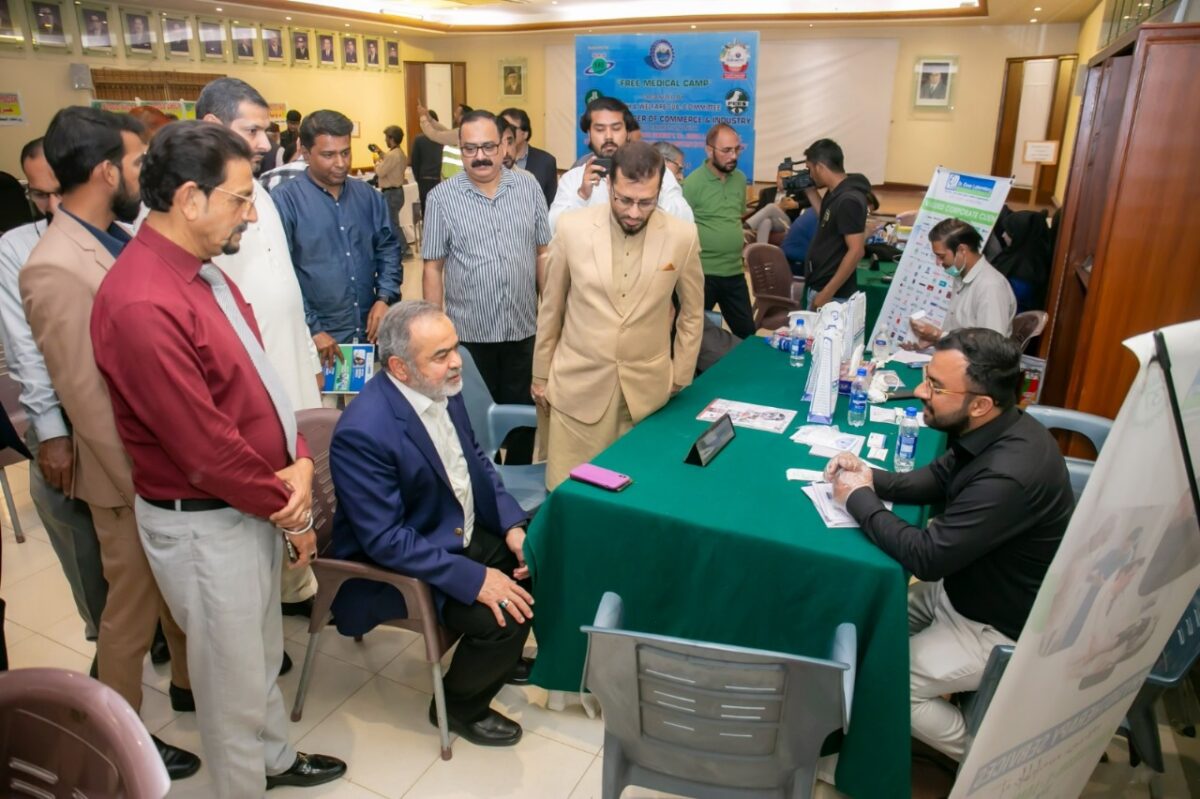 Karachi: In a bid to serve both its members and the broader community, the Karachi Chamber of Commerce & Industry (KCCI) partnered with Dr. Essa Laboratory & Diagnostic Centre, Al-Mustafa Welfare Trust, Khadim-e-Insaniyat, and the Pakistan Eye Bank Society to organize a Free Medical Camp at its premises. The event was well-attended by KCCI members and individuals from various backgrounds, reflecting the wide-ranging impact of the initiative.