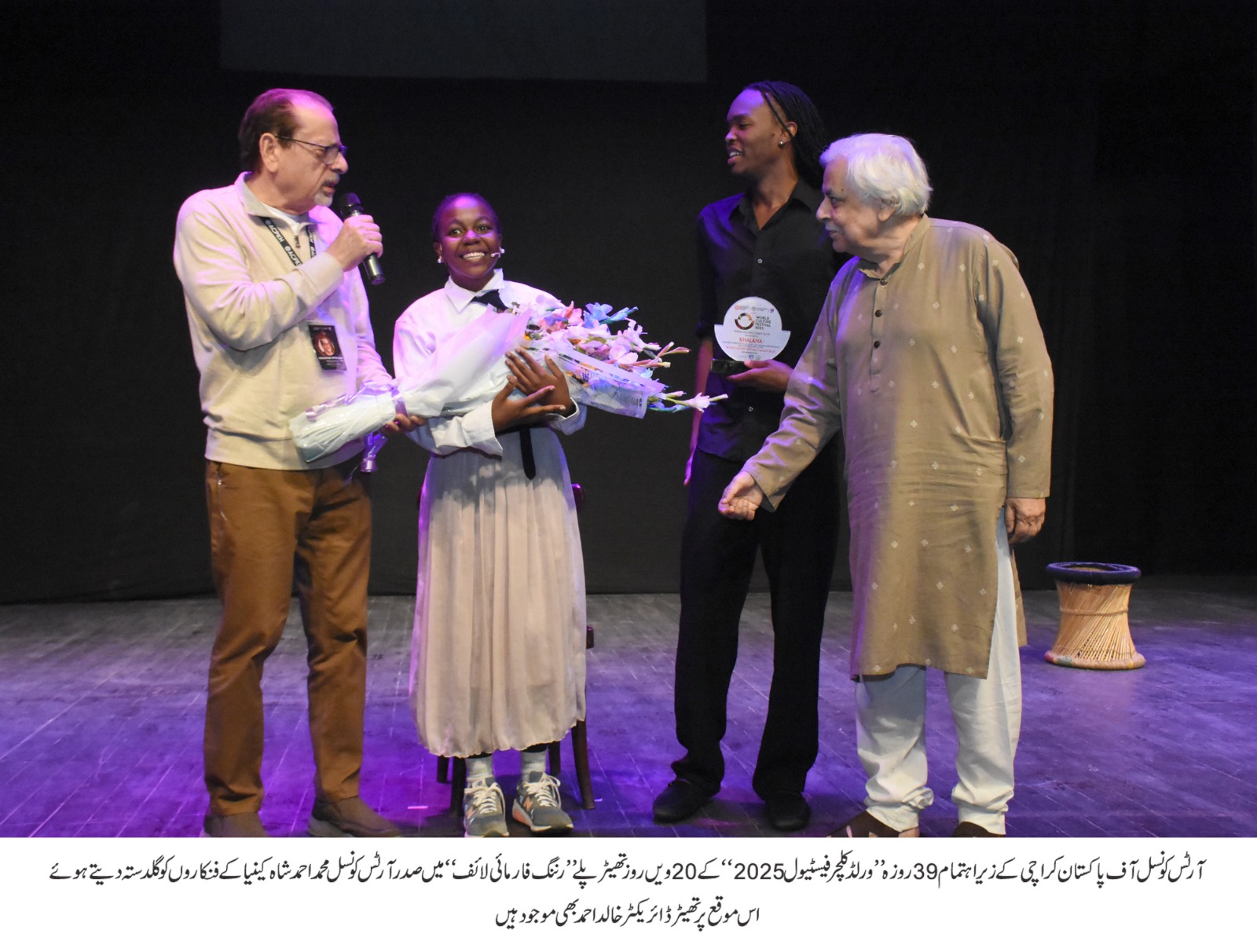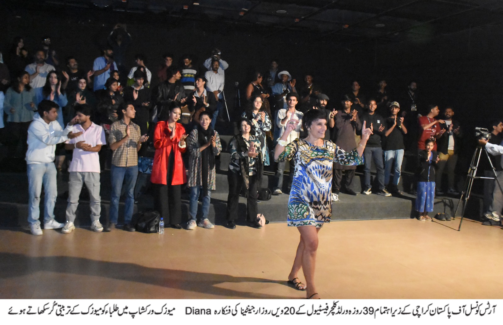Speaking to the workshop , Diana said, “Music has no boundaries. I am over fifty years old, yet I remain active. Musical instruments feel like memories to me. The most famous rhythm in my country is ‘Chaka Rira,’ created through clapping and vocal sounds. This music is part of our soul. Another rhythm we have is ‘Lendho,’ which is created using footwork. Music plays a vital role in connecting with people.” President Arts Council Karachi Muhammad Ahmed Shah presented Diana with a shield and a bouquet in recognition of her participation.