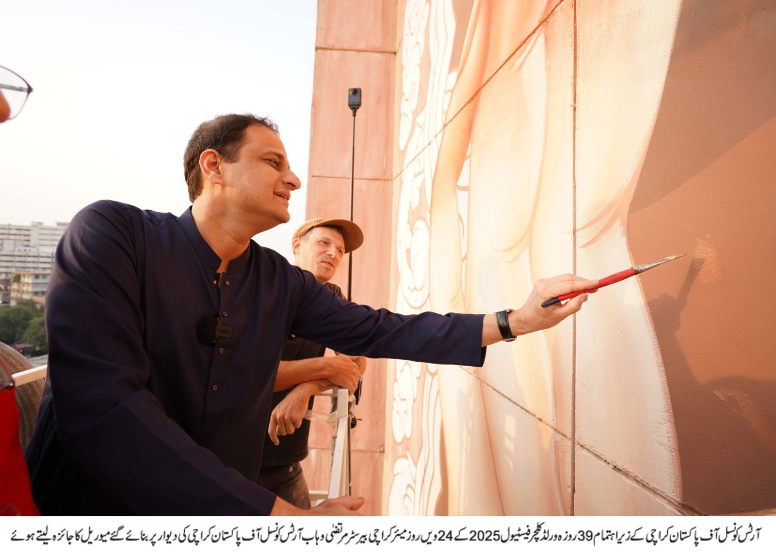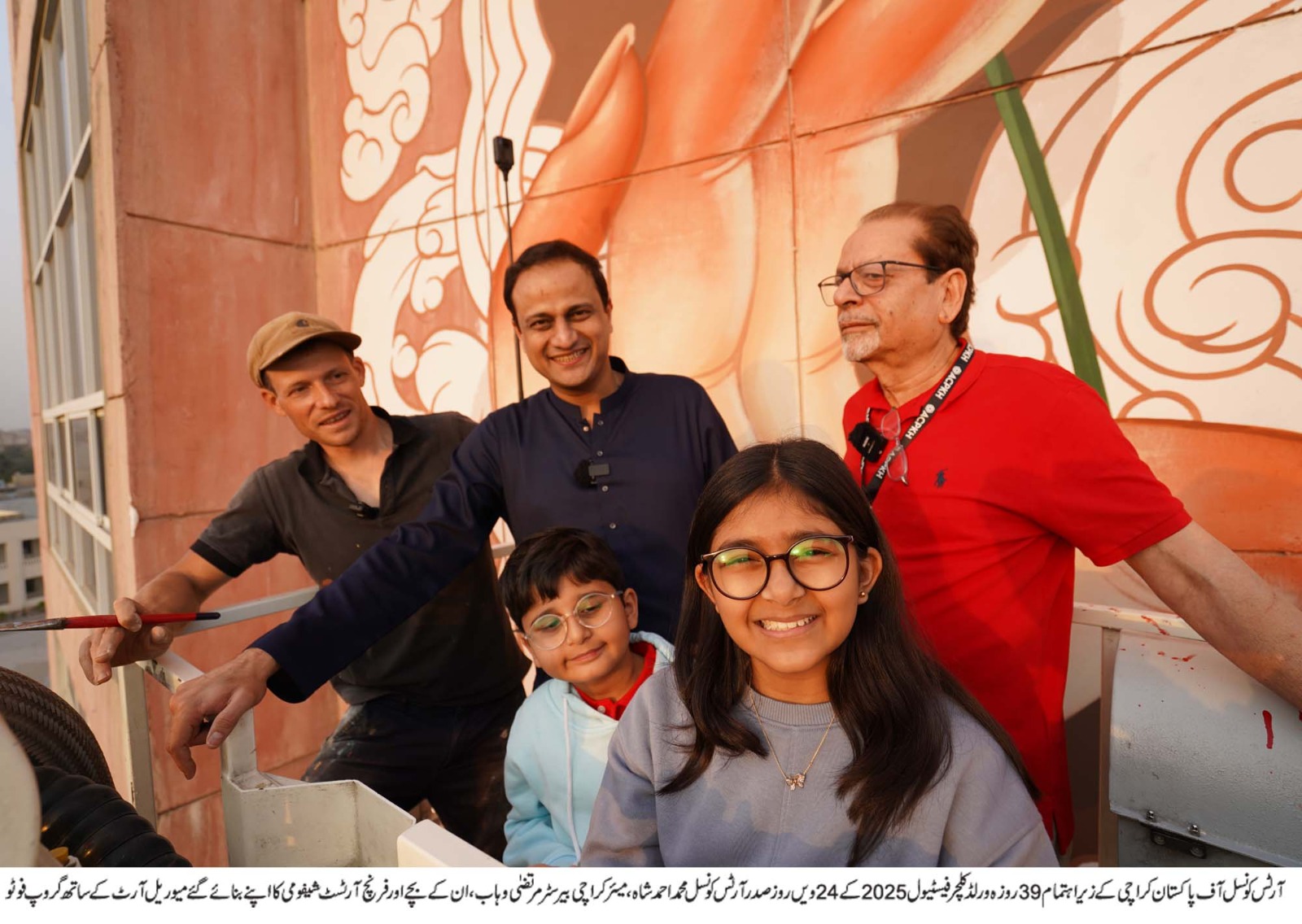Karachi: On the 24th day of the 39-day “World Culture Festival 2025”, Mayor Karachi Barrister Murtaza Wahab, along with his children, visited the Arts Council of Pakistan Karachi. President Arts Council Muhammad Ahmed Shah French artist Chifumi were also with him. The Mayor Karachi rode a snorkel along with his Children, and President ACP Muhammad Ahmed Shah viewed the mural art created by French artist Chifumi. The mural art has been named KARACHI BALOOMS.