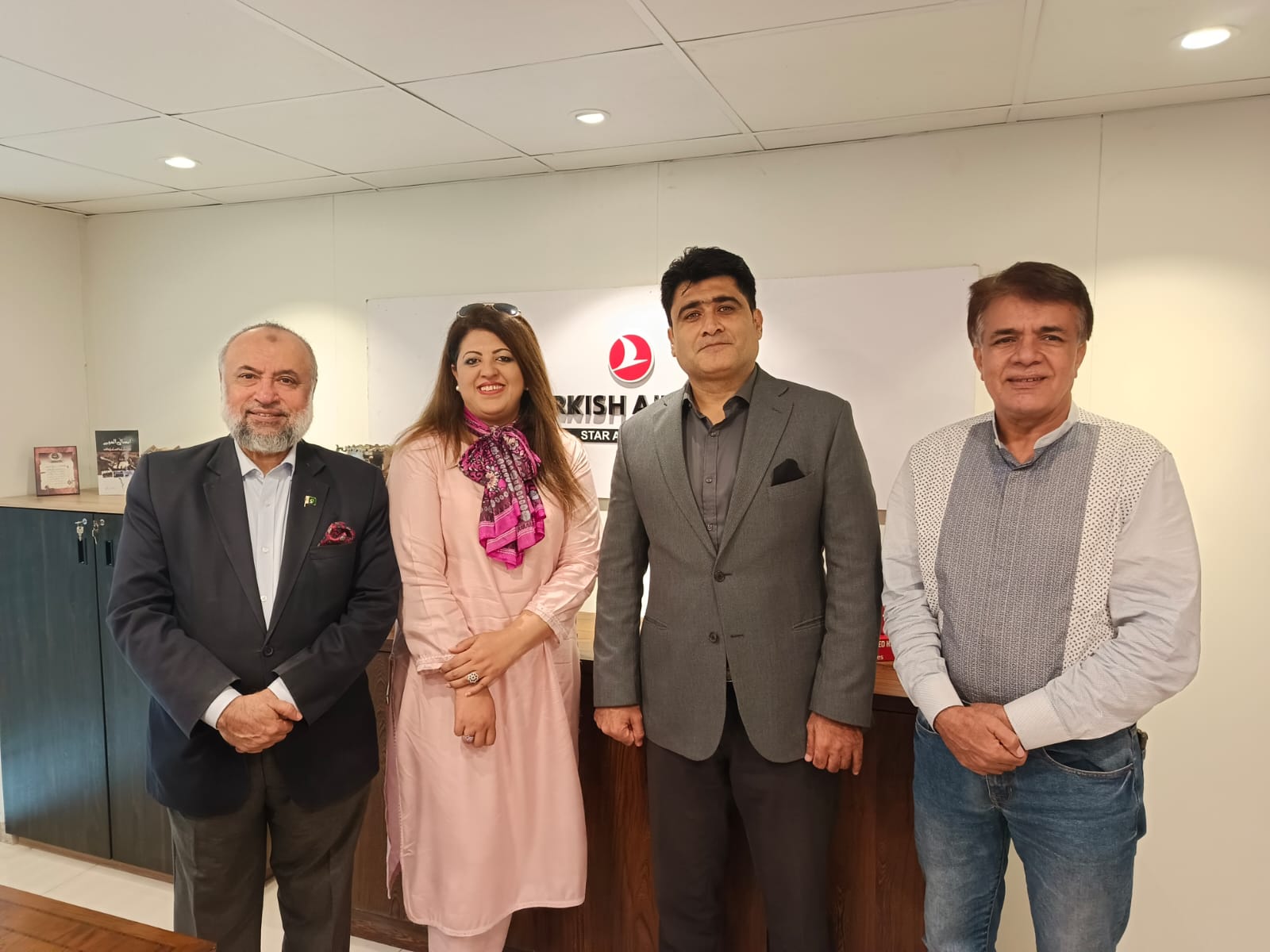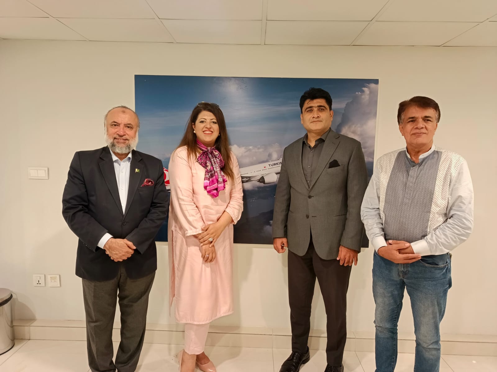 Karachi Pakistan : Group photo taken during the meeting with Mr. Umar Khan, Sales Manager of Turkish Airlines, at their Karachi office. Present in the photo are, Mr. Muhammad Farooq Afzal, President of the Pakistan-Turkey Business Forum, Ms. Iram Fawad, Deputy Convener for Economy and Women Trade Development at FPCCI and President of the Womenpreneur Pakistan Organization, and Mr. Syed Turaab Shah, Chairman of Azb Global Trade and Exhibitions.