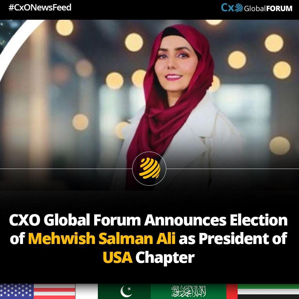 USA : Mehwish Salman Ali, visionary CEO and Co-Founder of Zahanat AI and Data Vault Pakistan, has been elected President of the USA Chapter of CxO Global Forum, a leading international platform connecting global C-level executives, technologists, and thought leaders. This prestigious appointment reflects Ms. Mehwish’s extraordinary contributions to artificial intelligence, entrepreneurship, and digital transformation across borders.