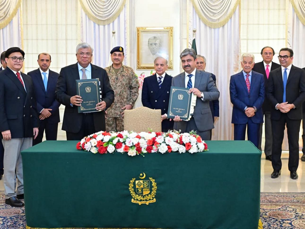 Islamabad Pakistan : Prime Minister Muhammad Shehbaz Sharif, Deputy Prime Minister and Foreign Minister Senator Ishaq Dar, Chief of Army Staff & Chief of Defence Forces Field Marshal Syed Asim Munir, Secretary Defence Muhammad Ali, and Cabinet Ministers witnessing the exchange of documents regarding the privatization of PIA between the Arif Habib Consortium and the Government of Pakistan, in Islamabad.