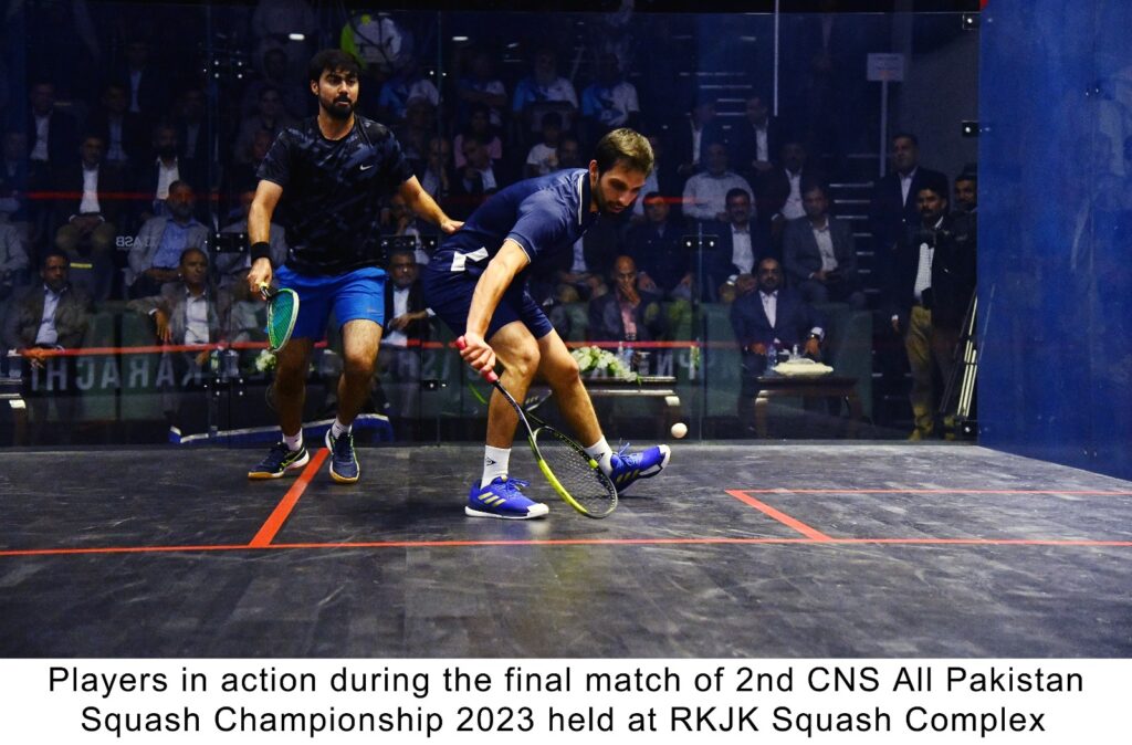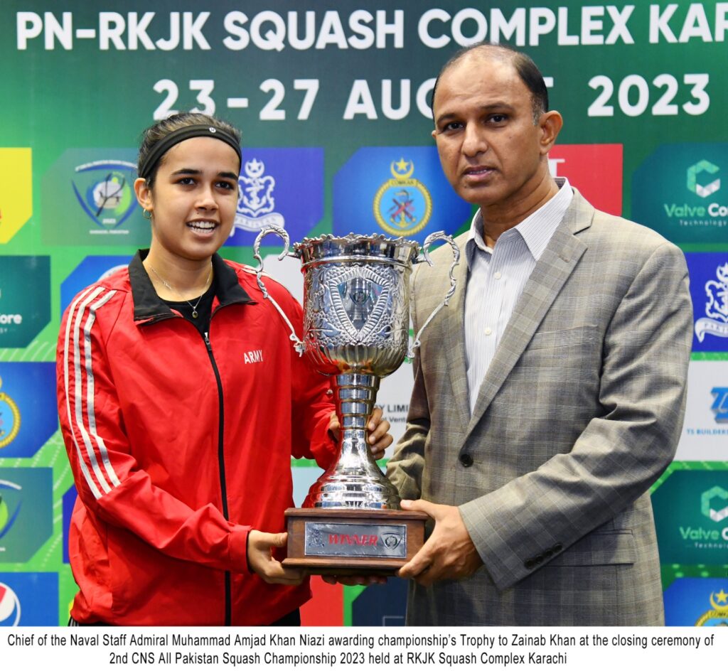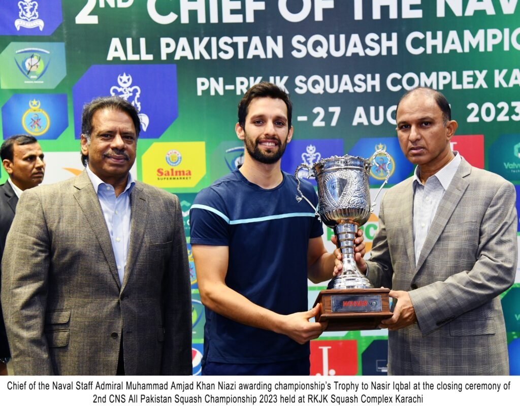 Karachi, 27 Aug 23: The final match and prize distribution ceremony of 2nd Chief of the Naval Staff Squash Championship 2023 was held at Pakistan Navy Roshan Khan Jahangir Khan Squash Complex, Karachi. The final match of Men Category of the tournament was played between Nasir Iqbal of WAPDA and Israr Ahmed of SNGPL and in women category between Noor -ul-ain of WAPDA and Zainab of Pakistan Army. After a tough and thrilling competition Nasir Iqbal of WAPDA and Zainab of Pakistan Army won the titles. Chief of the Naval Staff Admiral Muhammad Amjad Khan Niazi graced the occasion as Chief Guest.
