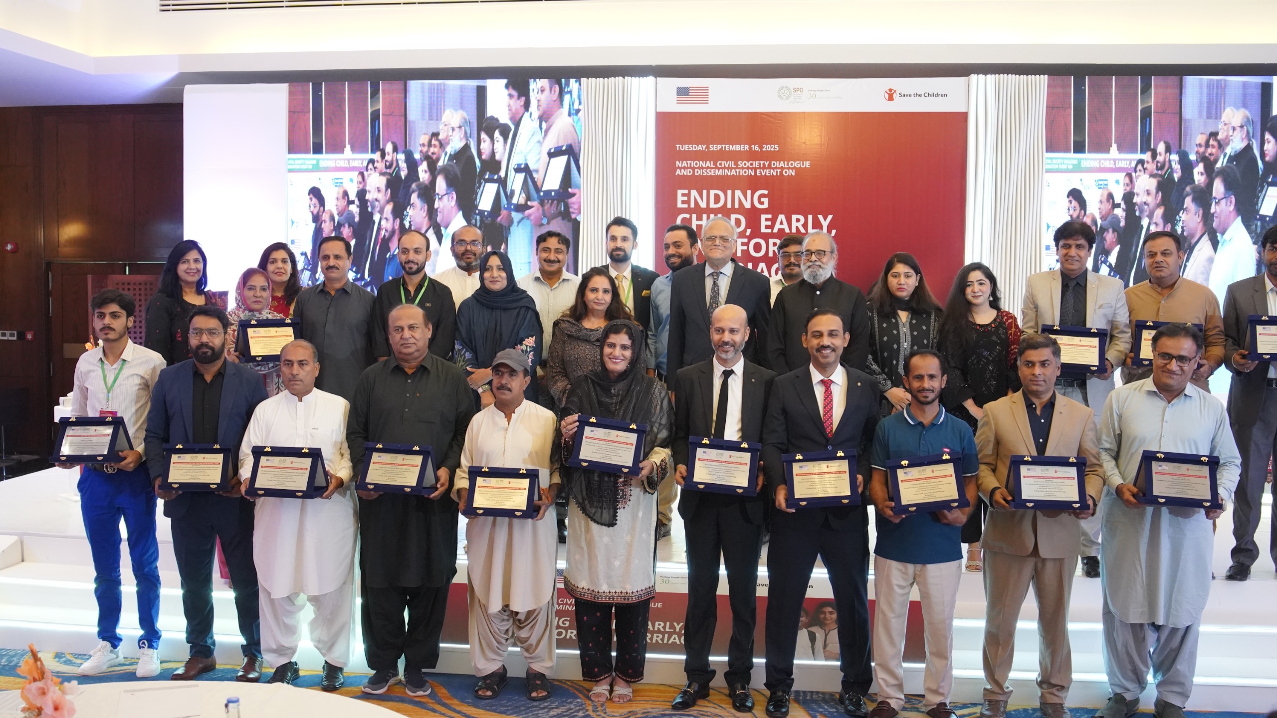 Islamabad, September 16, 2025 – Strengthening Participatory Organization (SPO), with support from the U.S. Department of State and Save the Children, successfully hosted the National Civil Society Dialogue and Dissemination Event on Ending Child, Early, and Forced Marriage (CEFM) under the Grassroots Action to End Child, Early, and Forced Marriage Project. The event, held at the Crystal Ballroom, Marriott Hotel, Islamabad, featured two panel discussions moderated by Ms. Farhat Ali Sheikh (Board Member, SPO) and Ms. Munazza Ali (Project Manager, Save the Children).