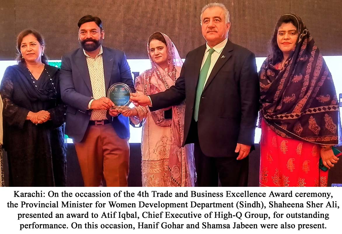 Karachi — On the occassion of 4th Trade and Business Excellence Award ceremony, the Provincial Minister for Women Development Department (Sindh), Shaheena Sher Ali, presented an award to Atif Iqbal, Chief Executive of High-Q Group, for outstanding performance. On this occasion, Chairman Gohar Group Hanif Gohar and Shamsa Jabeen were also present.