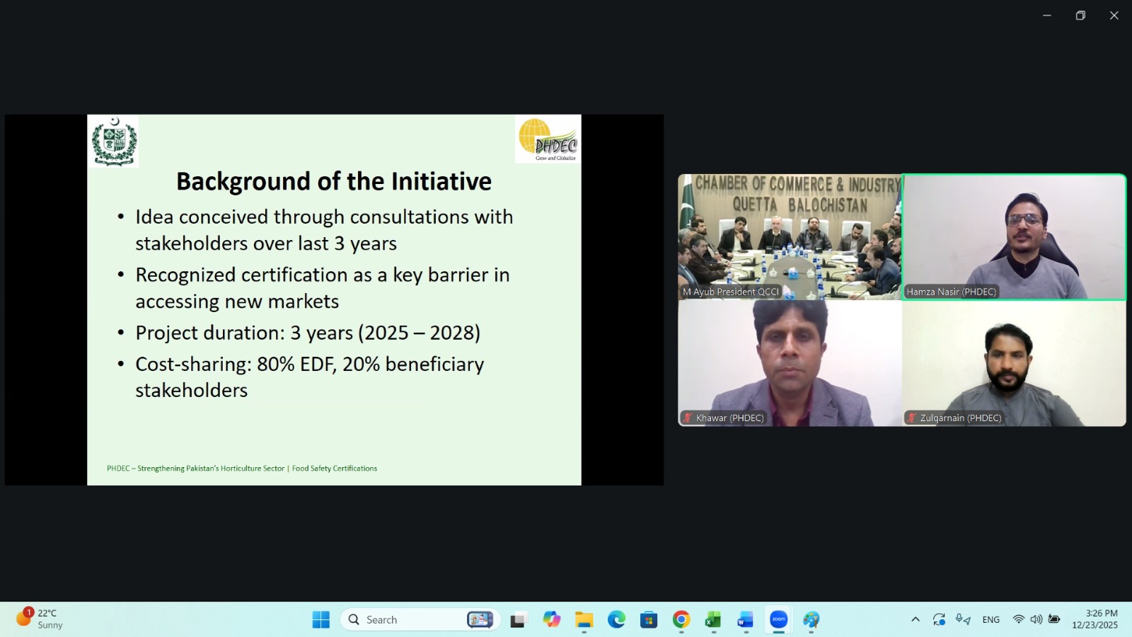 • Expedite the establishment of PHDEC’s regional office in Quetta and deployment of horticulture experts to strengthen coordination with growers, exporters, QCCI, and the Balochistan Agriculture Department.