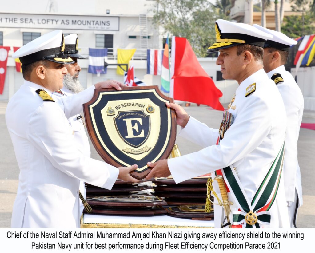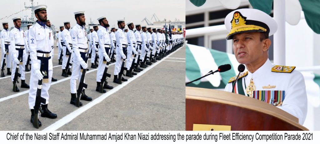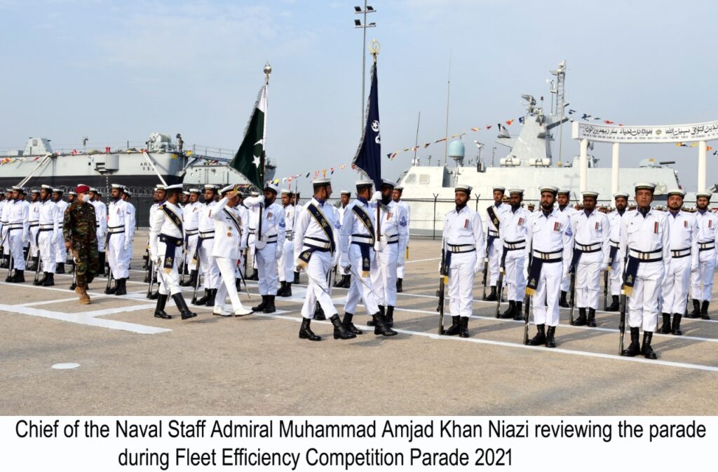 KARACHI-Pakistan Navy Fleet Annual Efficiency Competition Parade held at Pakistan Navy Dockyard, Karachi. Chief of the Naval Staff, Admiral Muhammad Amjad Khan Niazi graced the occasion as Chief Guest. Upon his arrival, the Chief Guest was received by Commander Pakistan Fleet, Vice Admiral Ovais Ahmed Bilgrami, and Guard of Honour was presented by a smartly turned-out contingent of the Pakistan Navy Fleet.