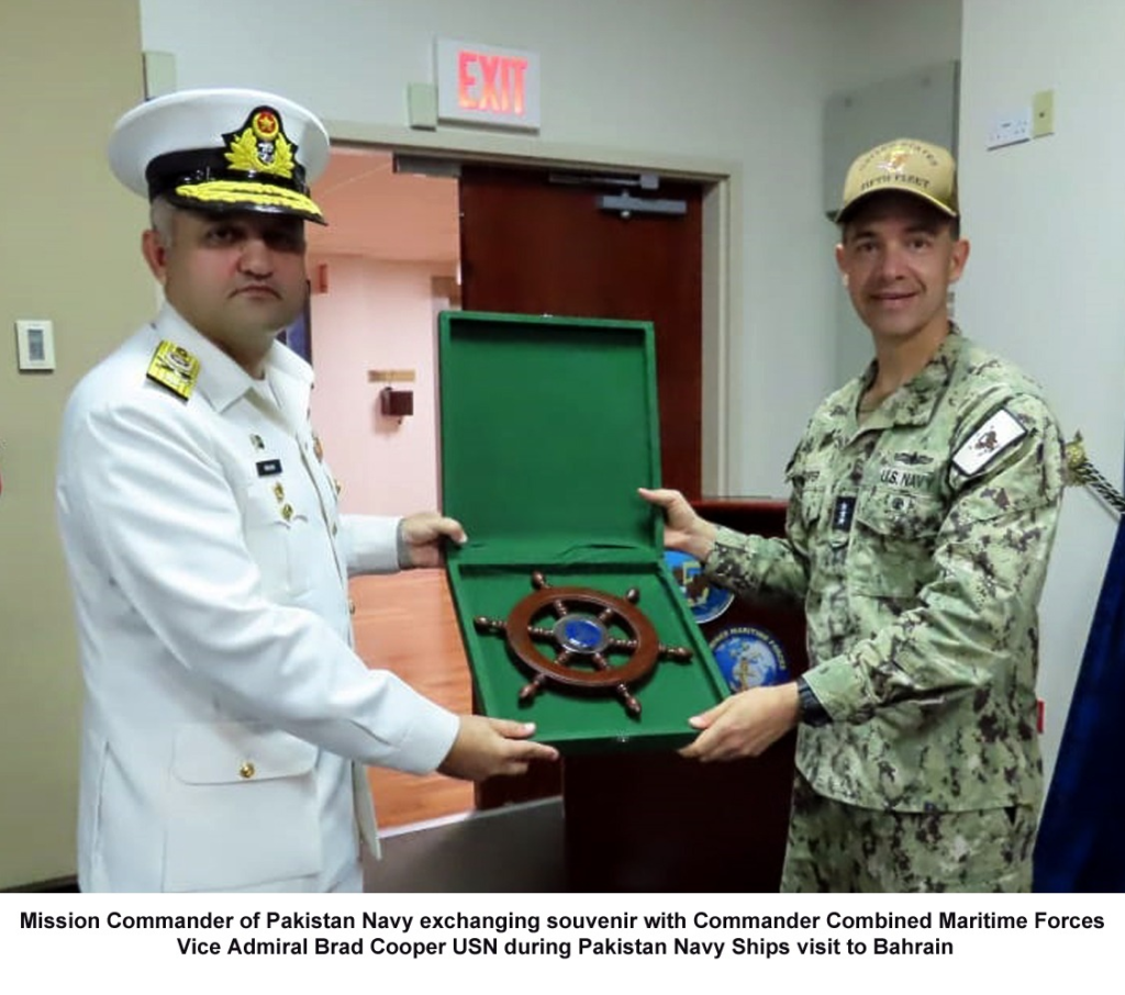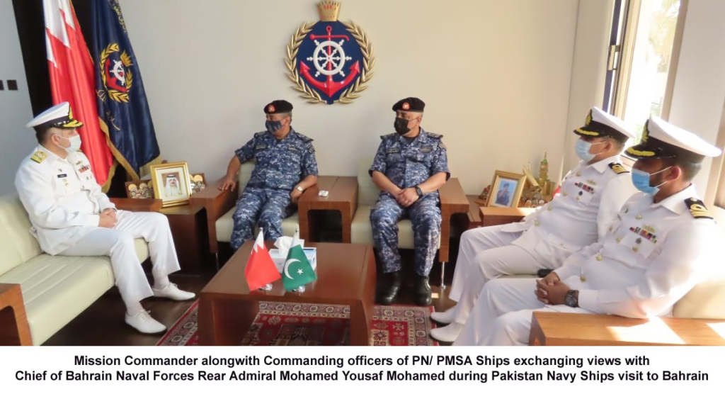 On arrival at Bahrain, PN ships were received by senior National representatives of Pakistan. The Mission Commander along with Commanding Officers called on Chief of Bahrain Naval Forces Rear Admiral Mohamed Yousaf Mohamed, Deputy Commander Royal Bahrain Coast Guard Commodore Jasim Mohamed Al Ghatam, Commander Combined Maritime Forces Vice Admiral Brad Cooper USN and Deputy Commander CMF Commodore Edward Ahlgren. During the meetings, matters of mutual interests and cooperation in the maritime domain were discussed and further collaboration in various domains was reaffirmed. On completion of port visit, PN ships conducted a bilateral exercise with Royal Bahrain Navy Ship RBNS AL AREEN aimed at further enhancing interoperability between the two navies.