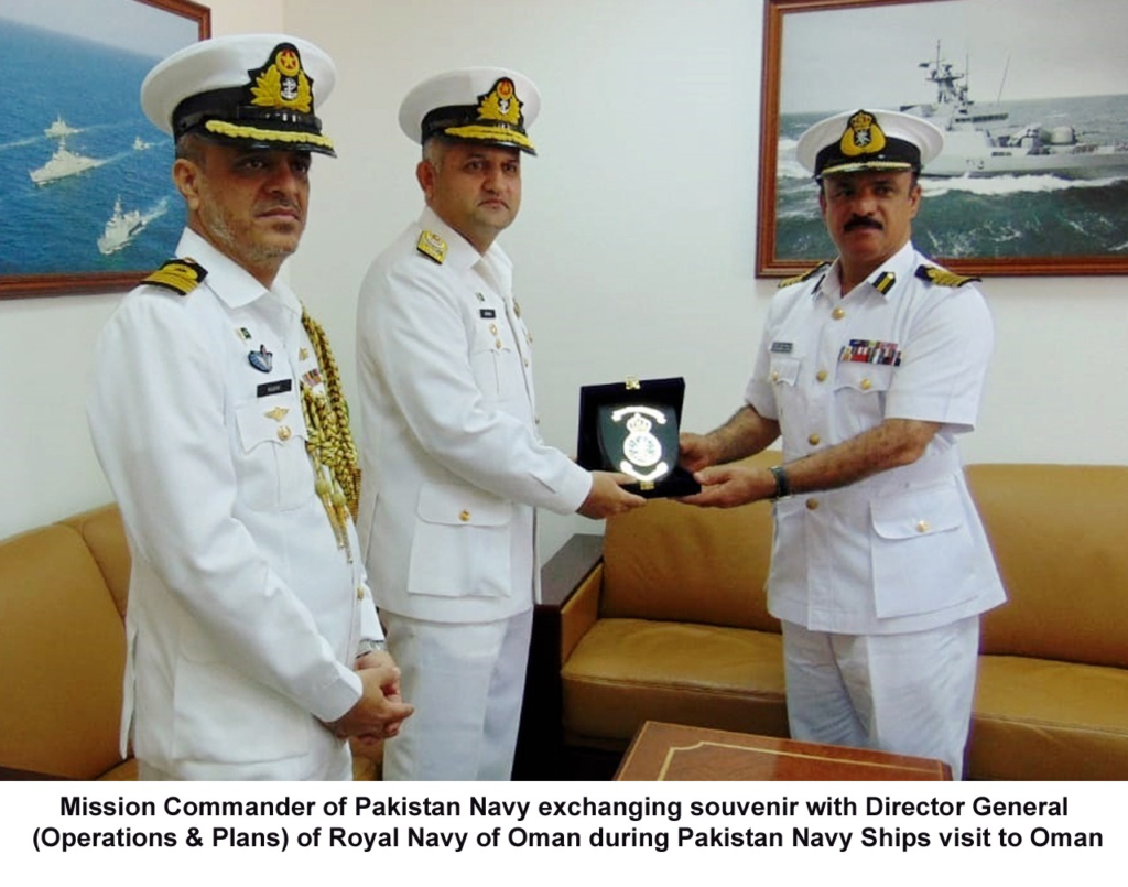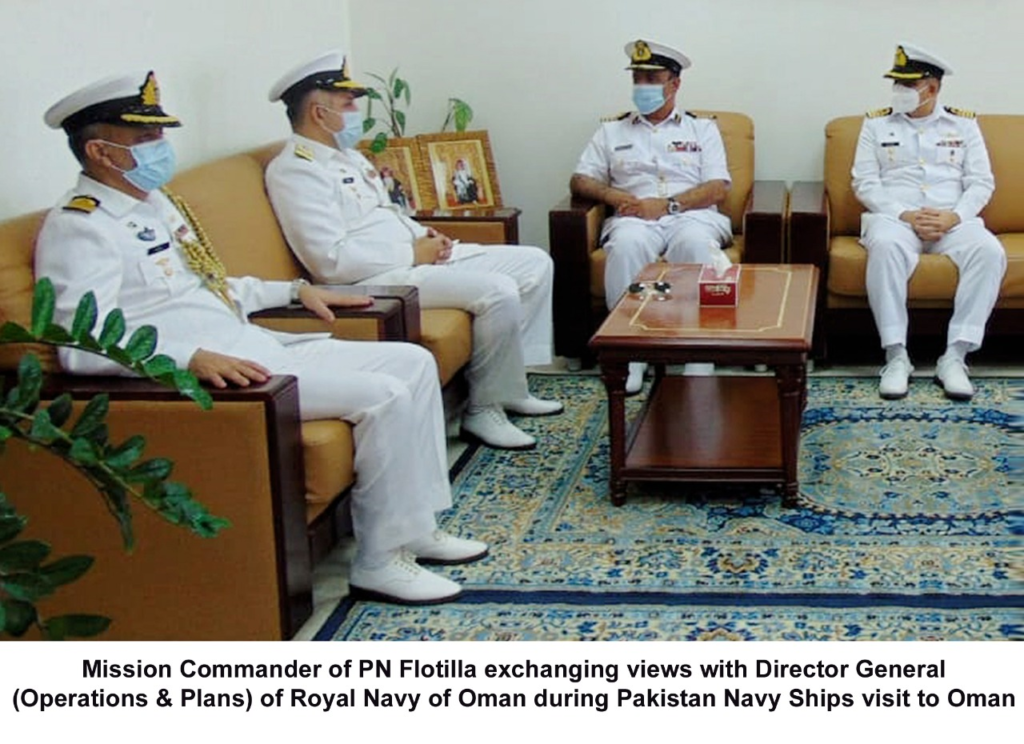 Earlier, PN flotilla visited port Sultan Qaboos in Oman. Upon arrival at the port, the visiting ships were received by the Defence Attache of Pakistan at Oman along with officers of the Royal Navy of Oman. During the stay at the port, the Pakistan Navy Mission Commander along with Defence Attache and Commanding Officers of visiting ships called on Director General Operations & Plans Captain Jasim Muhammad Al Baloshi at Headquarters Royal Navy of Oman.