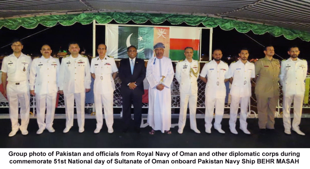 On the occasion of the 51st National Day of Sultanate of Oman, Mission Commander conveyed sincere regards from Chief of the Naval Staff Admiral Muhammad Amjad Khan Niazi for the people of Oman on their National Day. Members of Majlis-e-Shura and Majlis-e-Daula of Oman along with dignitaries/ military representatives of other countries visited onboard PN ships.