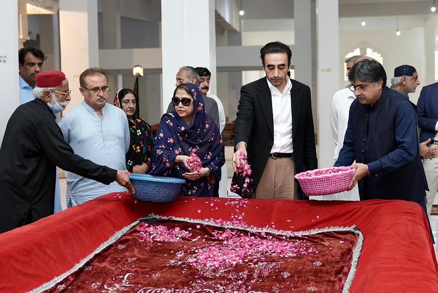 Larkana: Chairman Bilawal Bhutto Zardari, accompanied by PPP Women’s Wing Central President Faryal Talpur, offered respects at the graves of Shaheed Zulfikar Ali Bhutto and Shaheed Mohtarma Benazir Bhutto.