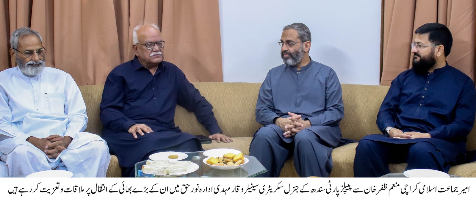 Karachi : Pakistan People’s Party (PPP) Sindh General Secretary Senator Waqar Mehdi met with Jamaat-e-Islami Karachi Ameer Muneem Zafar at the party’s office, Idara Noor-e-Haq, to offer condolences on the passing of his elder brother. He also prayed for the departed soul. On the occasion, Jamaat-e-Islami MPA Muhammad Farooq and party leader Muslim Parvez were also present.