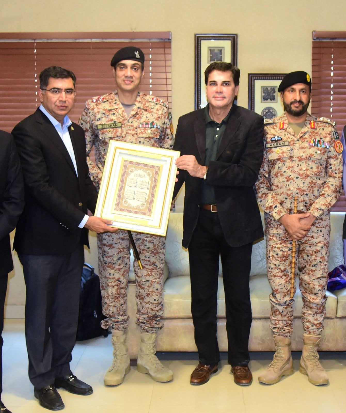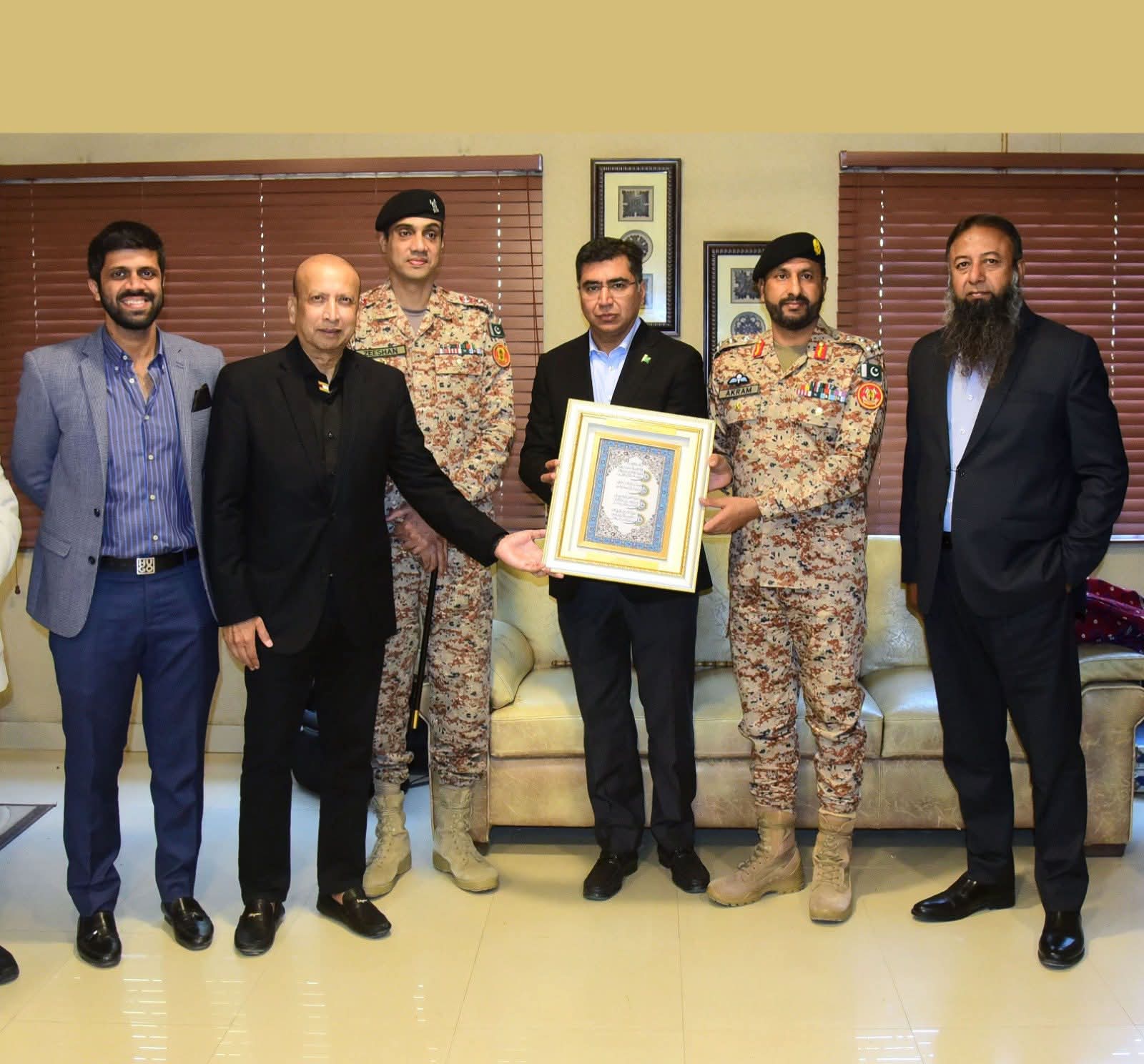 The participants highly appreciated the dedicated efforts of the Pakistan Rangers and Sindh Police for their continued commitment and tireless services in maintaining law and order across the city. As a token of appreciation, Crests and Ayat frames were presented to the distinguished guests.