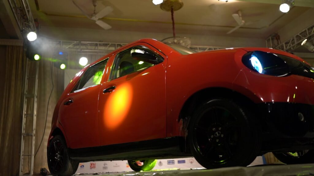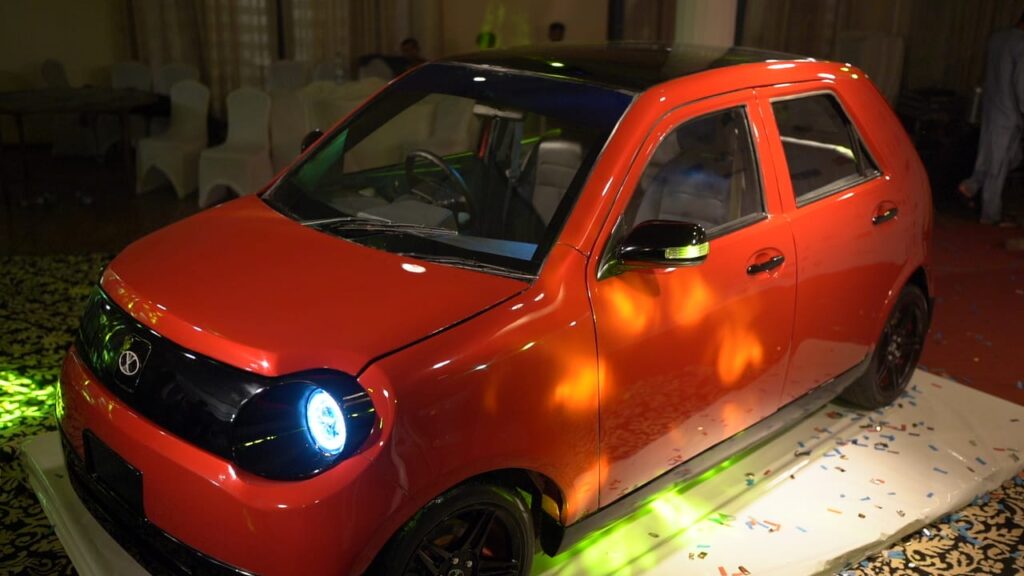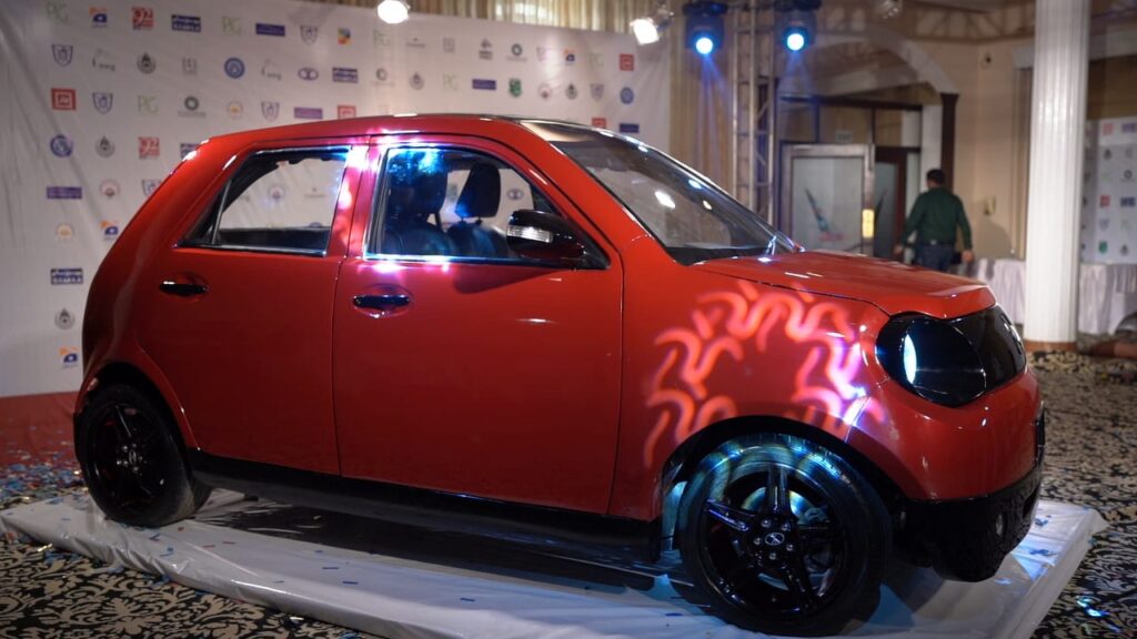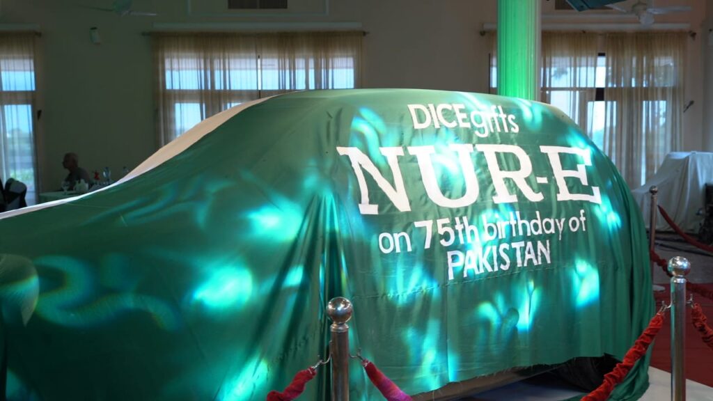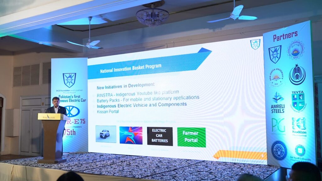 High profile guests and media gathered here at Beach Luxury Hotel earlier today to witness the unveiling of Nur-E 75, Pakistan’s first electric car prototype. Presented as a gift for Pakistan on its third silver jubilee, the car has been designed and developed by DICE Foundation, a US-based non-profit organization, run by expatriate Pakistanis from US, EU, etc. along with support from local academia and industry. DICE Foundation has been working in Pakistan for the last 15 years promoting innovation, capability building, converting ‘Brain Drain’ into ‘Brain Gain’.