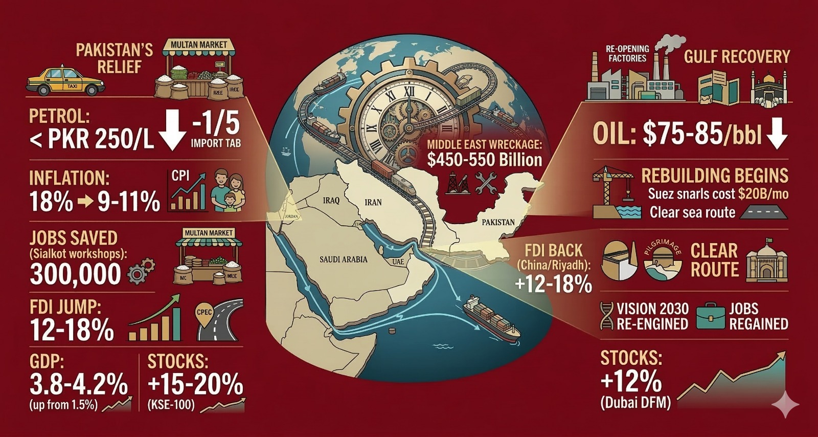 A Hard-Won Breather for Struggling Families Imagine the relief washing over a Lahore cab driver as petrol prices dip from PKR 350 to under 250 a liter. Oil, jacked up to $110 a barrel from Gulf strikes, eases back to $75-85, trimming Pakistan’s massive $25 billion import tab by nearly a fifth. Families stretch their rupees further—cooking gas cheaper, school buses running smoother—pulling the Consumer Price Index down from a brutal 18% to 9-11%. It’s not magic; it’s moms in Multan buying rice without tears. Pakistan’s factories fire up too. We send $4.5 billion in textiles, rice, and fruits to Saudi and UAE yearly; clear seas mean Sialkot workshops buzz again, saving 300,000 jobs from the brink. Foreign cash flows back—FDI, down 35% in the scare, jumps 12-18% with China speeding CPEC roads and Riyadh loosening purse strings. GDP climbs to 3.8-4.2% from a limp 1.5%, remittances holding steady at $32 billion keep the rupee from crumbling past 290 to the dollar. Stocks? They party. KSE-100, down 22% in the frenzy, surges 15-20%, just like S&P 500’s 8-10% pop and Dubai’s DFM leaping 12%. Tourism gets a lifeline—Gilgit trails see a few more hikers, Iran’s pilgrims trickle back up 10-15%, though scars run deep. ?The Middle East counts a staggering $450-550 billion in wreckage: wrecked rigs, Suez snarls costing $20 billion a month, 2.5 million jobs smoked in oil and ports. Tourism’s gutted—Dubai hotels at 40% empty, Mecca down 25%, a $90 billion hole.