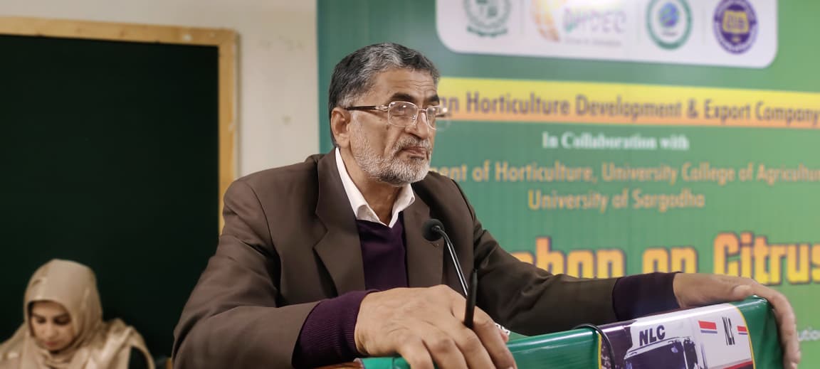Dr. Rashad Mukhtar, Chairman of the Department of Horticulture at the College of Agriculture, University of Sargodha, informed participants that the college maintains a germplasm collection of over 95 citrus cultivars, including exotic and improved varieties. He offered certified nursery plants to farmers at nominal prices and emphasized the need for institutional collaboration between PHDEC, CRI, and academia to revitalize citrus production in the Sargodha region.