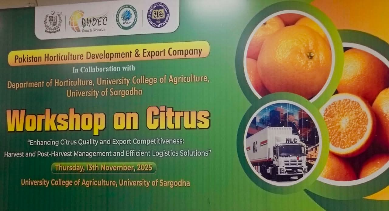 Sargodha, November 13, 2025 — Pakistan Horticulture Development and Export Company (PHDEC) organized a comprehensive workshop in Sargodha titled “Enhancing Citrus Quality and Export Competitiveness: Harvest and Postharvest Management and Efficient Logistics Solutions.” Sargodha, known as the citrus capital of Pakistan, plays a vital role in the country’s horticultural economy.