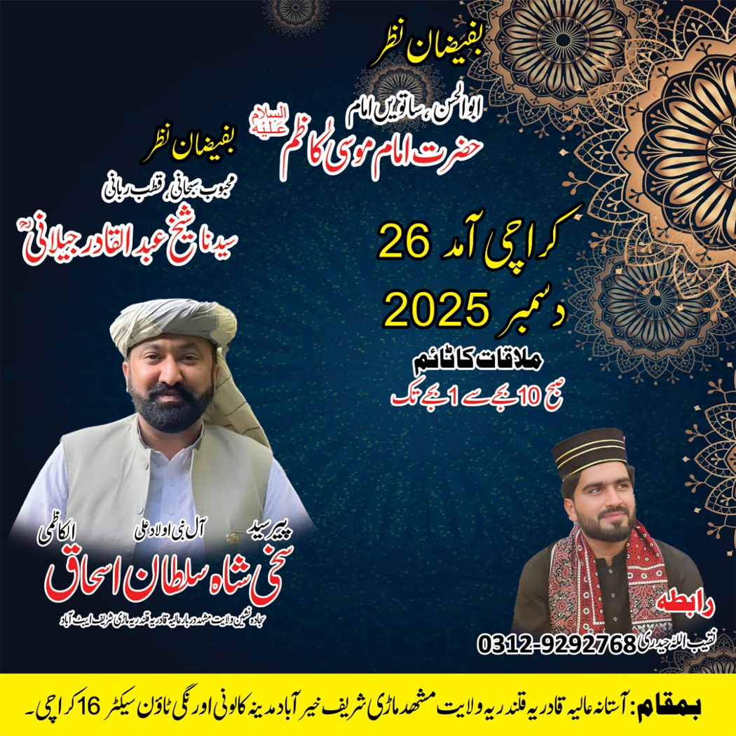 Karachi : Sahibzada Syed Shah Sultan Kazmi is known as a great Sufi saint and a respected member of the Sadat-e-Kazmi order. He belonged to the Sadat-e-Kazemi (descendants of Hazrat Imam Musa Kazim (AS). He played a prominent role in the propagation of Islam, spirituality, and social reform. He is respected by the public for his piety, asceticism, and divinity. In some areas, his shrine/dargah is a place of worship where people pray and attend. Abul Hasan, the seventh Imam, Hazrat Imam Musa Kazim (a.s.), Beidhan Nazar Mahboob Subhani, Qutb Rabbani, Sayyidna Sheikh Abdul Qadir Jilani (r.a.), Pir Syed Sakhi Shah Sultan Ishaq Al-Kazmi, Aal Nabi Alad Ali, Sajada Nashin of the province of Mashhad, Darbar Alia Qadriyya Mari Sharif, Abbottabad On December 26, Jumma-ul-Mubarak will be held at Astana Alia Qadria Qalandaria Mashhadmari Sharif Khairabad Medina Colony Orangi Town Sector 16 Karachi. Followers can meet from 10 am to 1 pm.