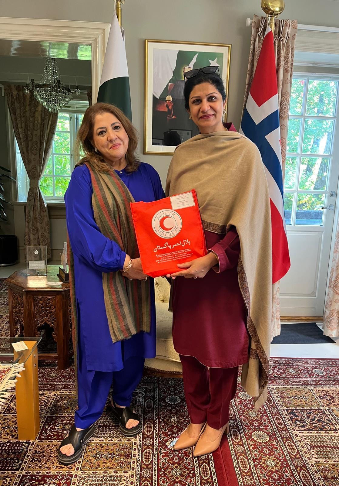 Oslo, Norway — The Chairperson of the Pakistan Red Crescent Society, Mrs Farzhana Naek, held a meeting with Pakistan’s Ambassador to Norway, Mrs Sadia Altaf Qazi, in Oslo.
